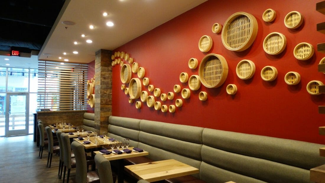 This restaurant features a vibrant red wall. You can also see artwork made of bamboo steamers coming in various sizes. It is such a brilliant way to give a second life to unused things.