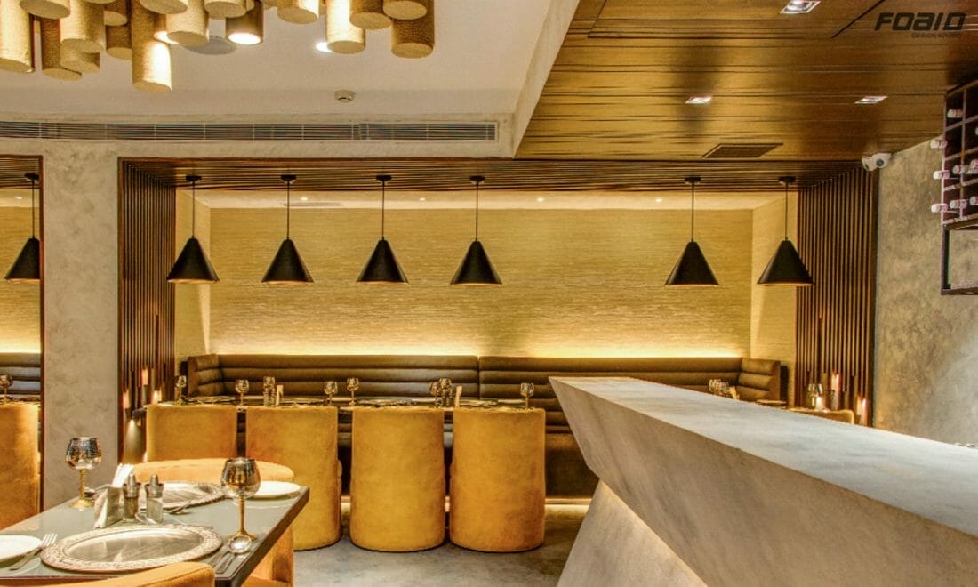 This restaurant looks glamorous with gold walls and a super comfy seat. As a result, those combinations create luxury instantly.