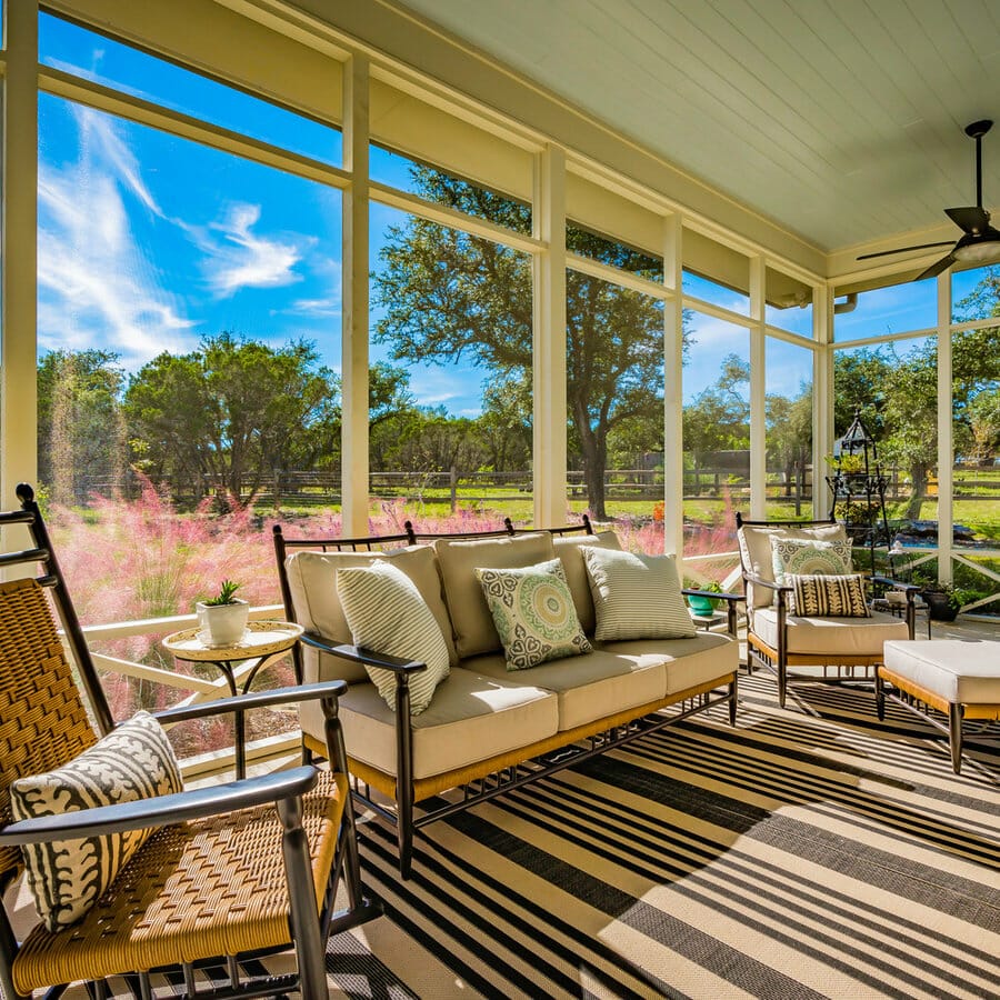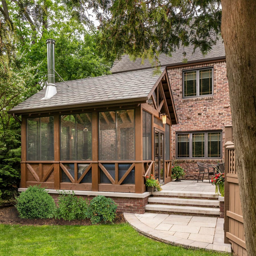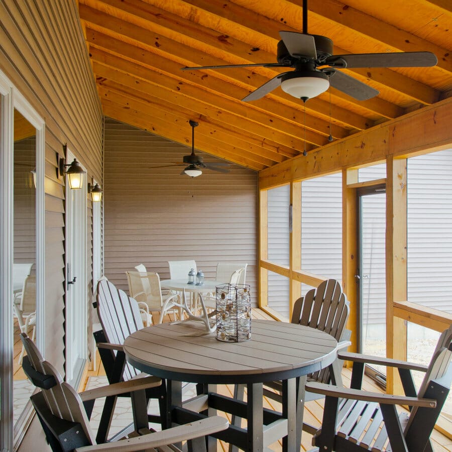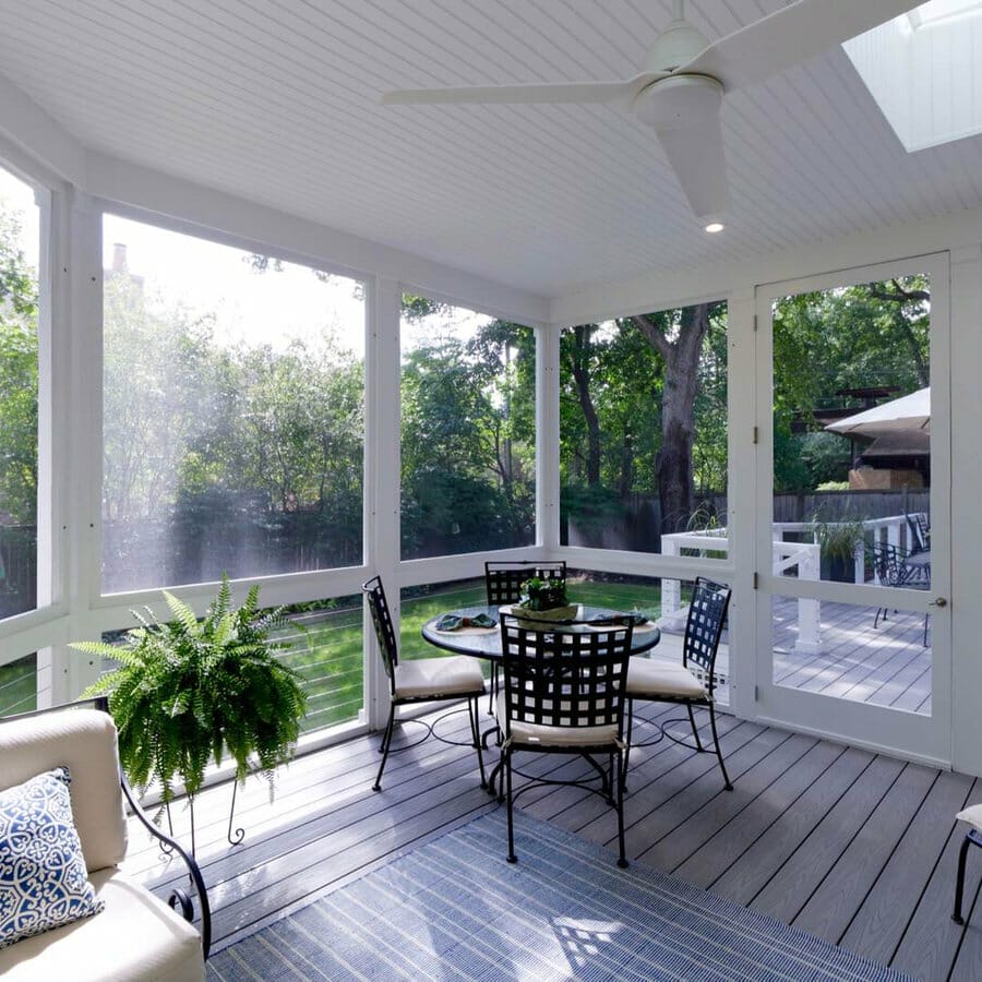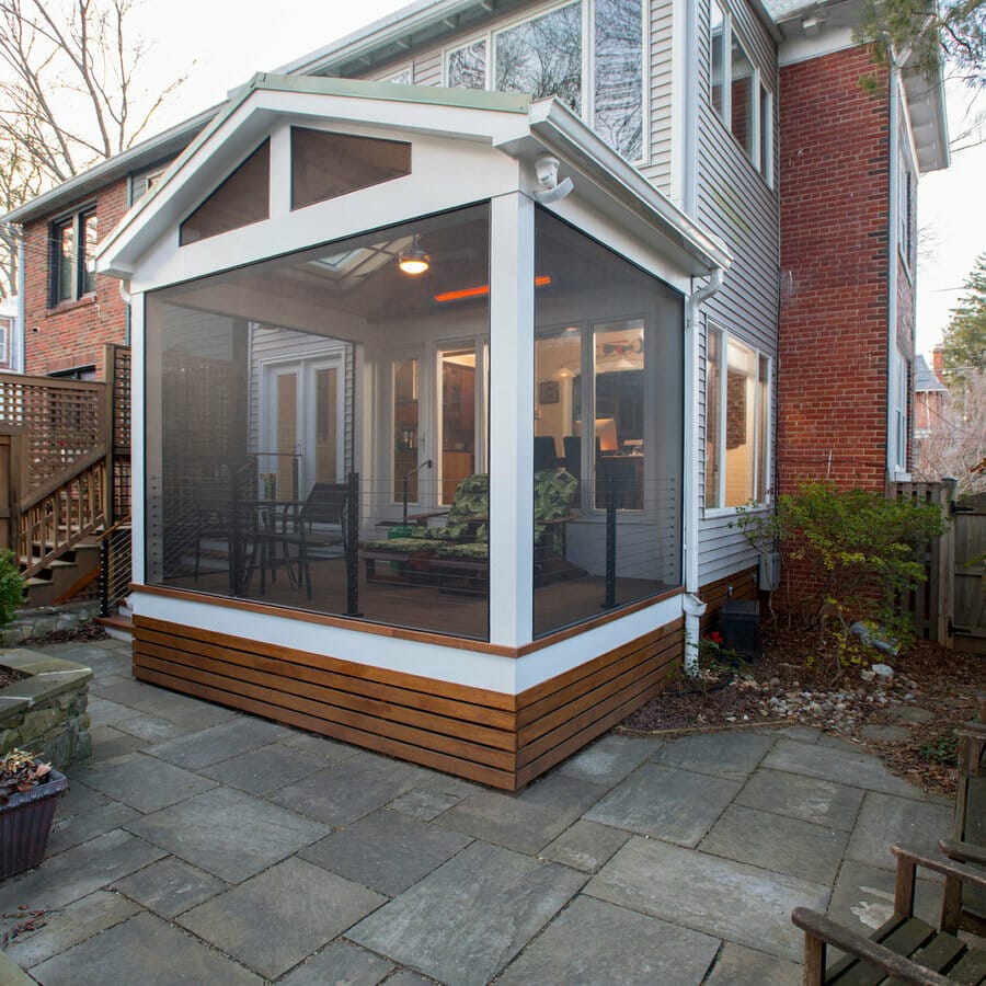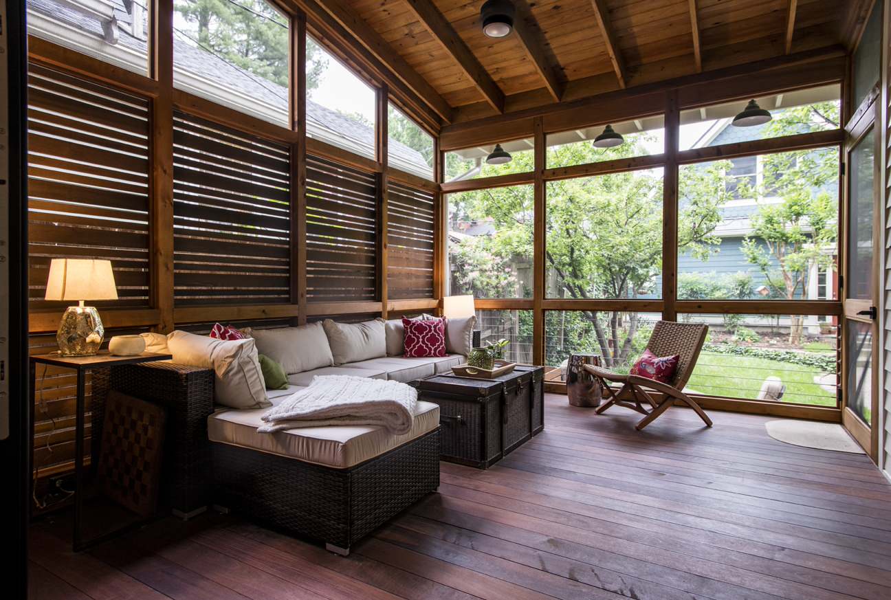 At 16×16 square feet, this Ottawa screened-in back porch could house a private conversation with sicker seating set above the grey rug.