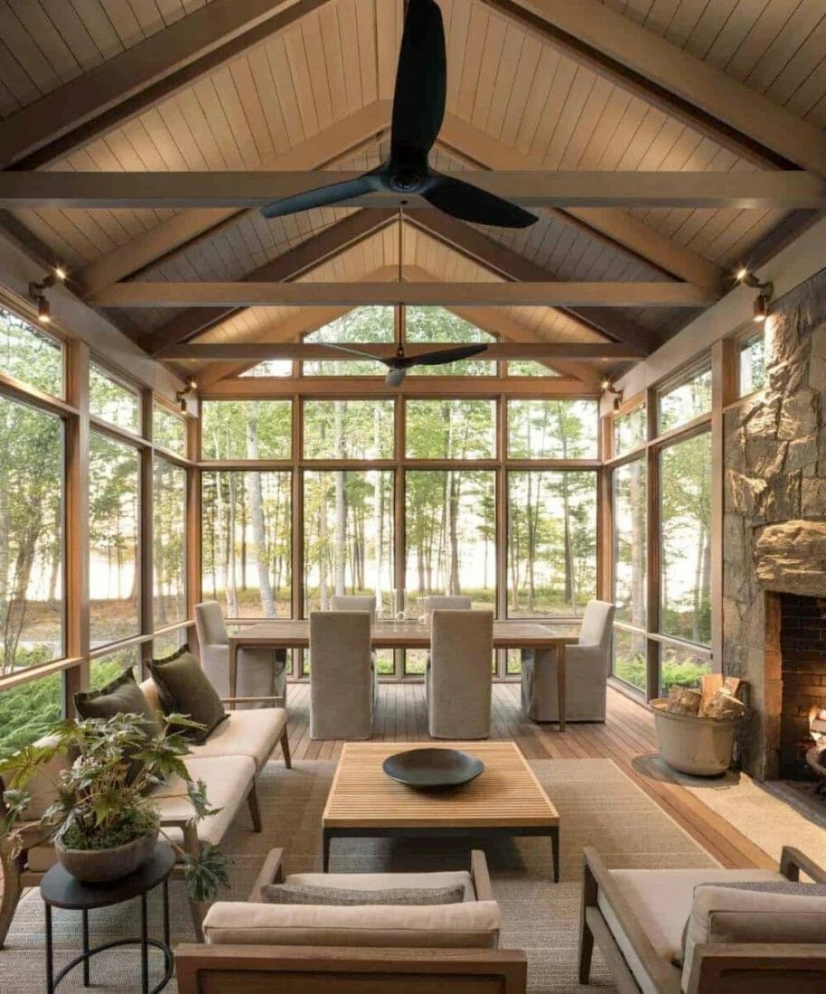 Inside, recessed lighting and a pair of ceiling fans are ready to assist any activity done under the cedar roof. A dining set and other seating are also present on these simple screened in porch ideas.