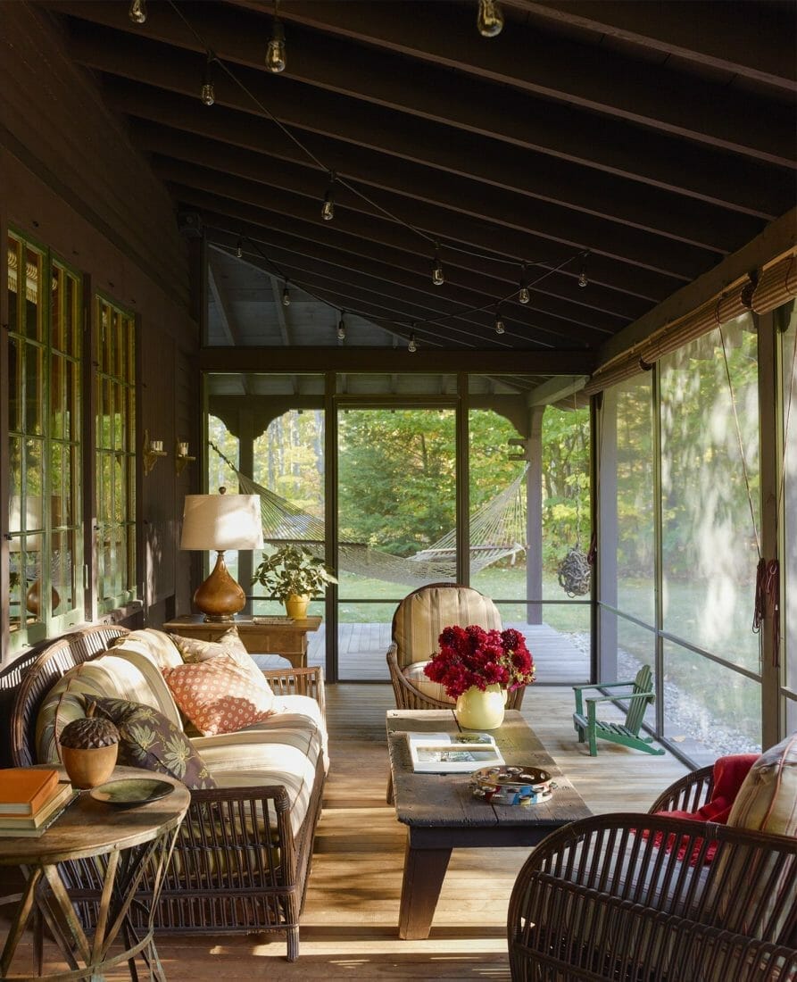 Even though the table lamp takes exterior illumination to another level, it is not the only lighting feature on this New Hampshire screened-in porch.