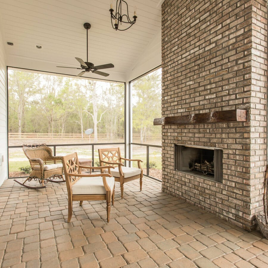 Located in Orlando, it is a farmhouse porch with a brick fireplace wall. The exposed look reminds you of country houses with smoke out of the chimney.