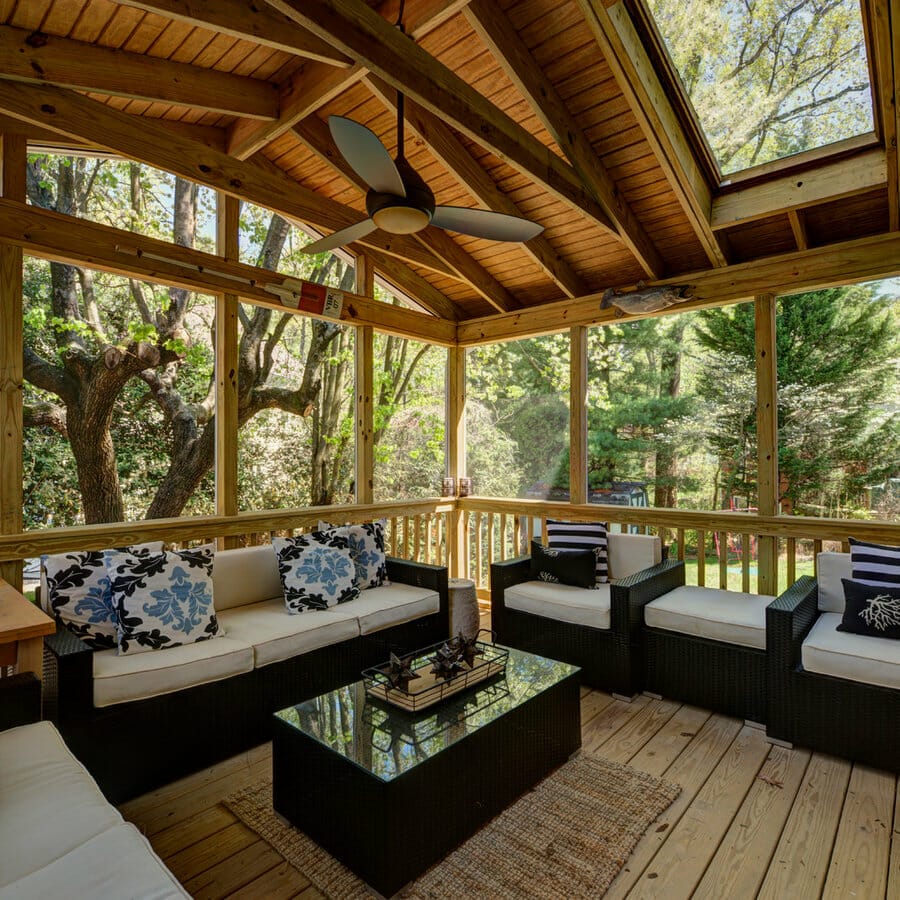 Built above a deck, it is a farmhouse screened-in porch with a roof extension. Inside a 12×16 square feet covered area, some seating is present to accommodate enjoyable retreat times.