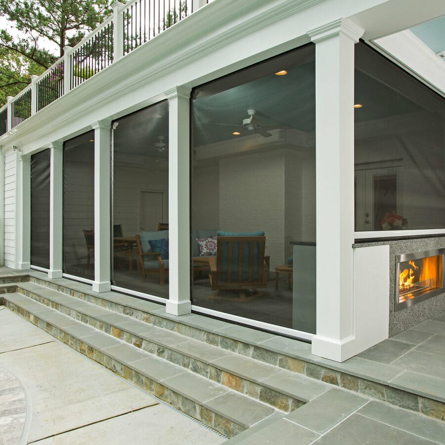 A Boston modern porch utilizes some pieces of big tile screens to make an open space consisting of a meeting room and an additional living room with a fireplace as its focal point.