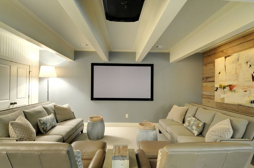 Paint the wall with cool pale shade and arrange most furniture in similar tone. Mount a fixed projection screen at the center.