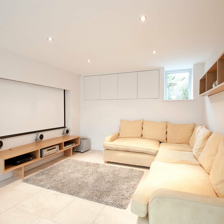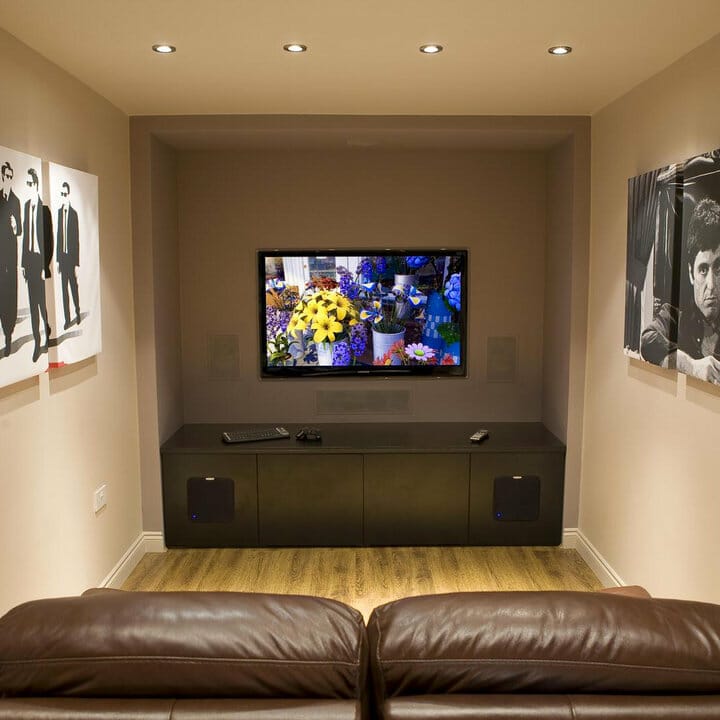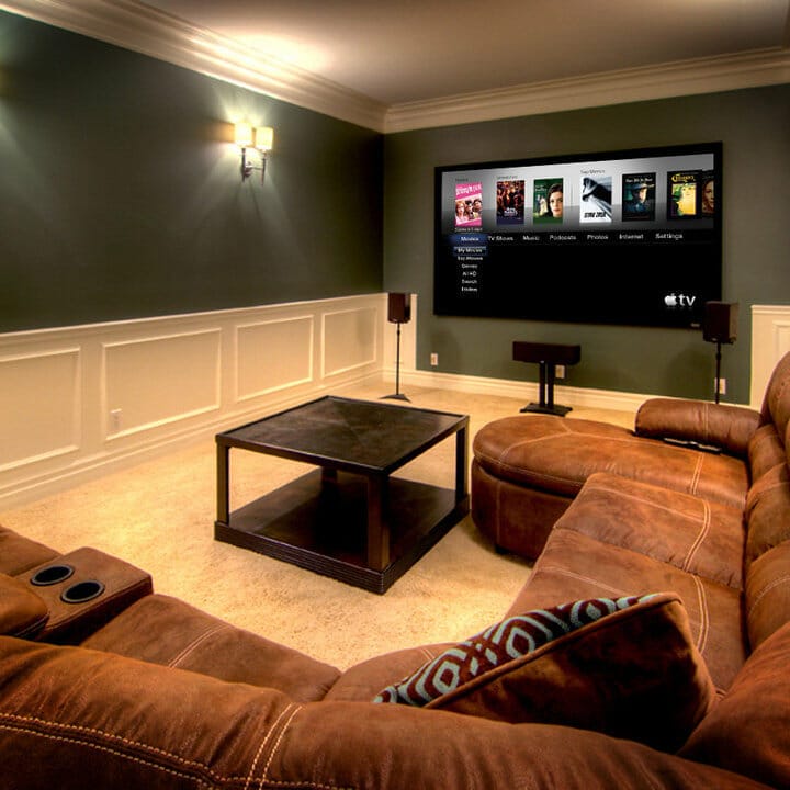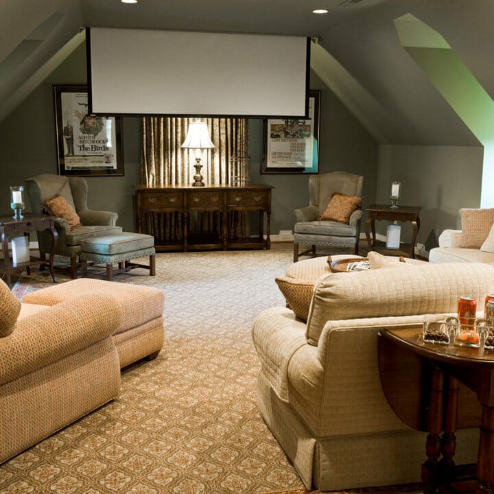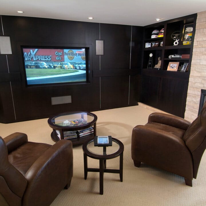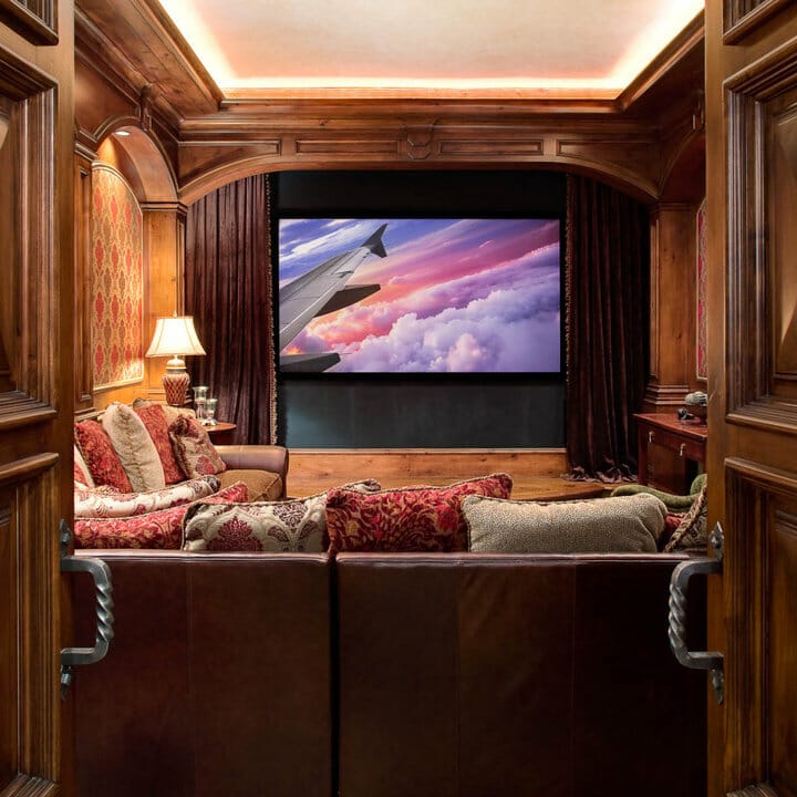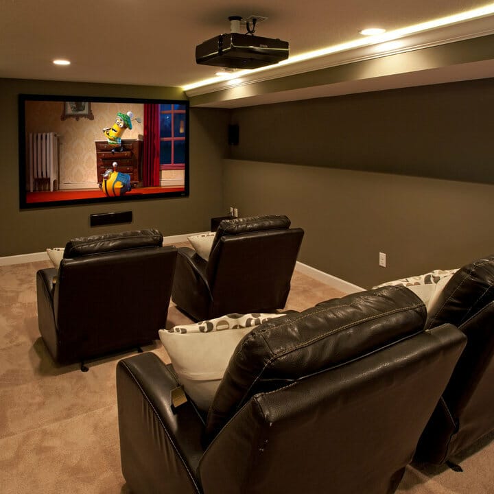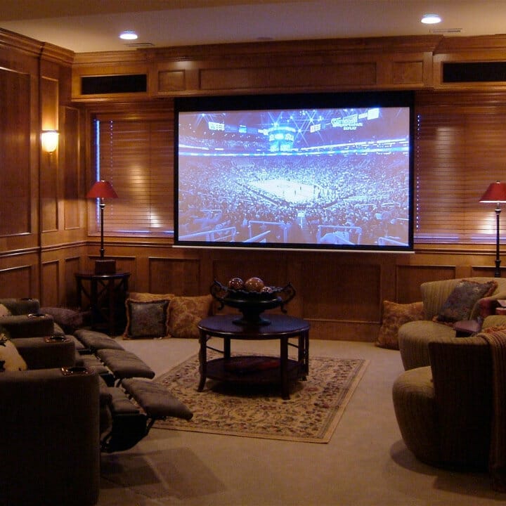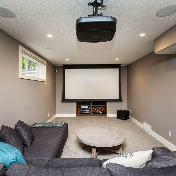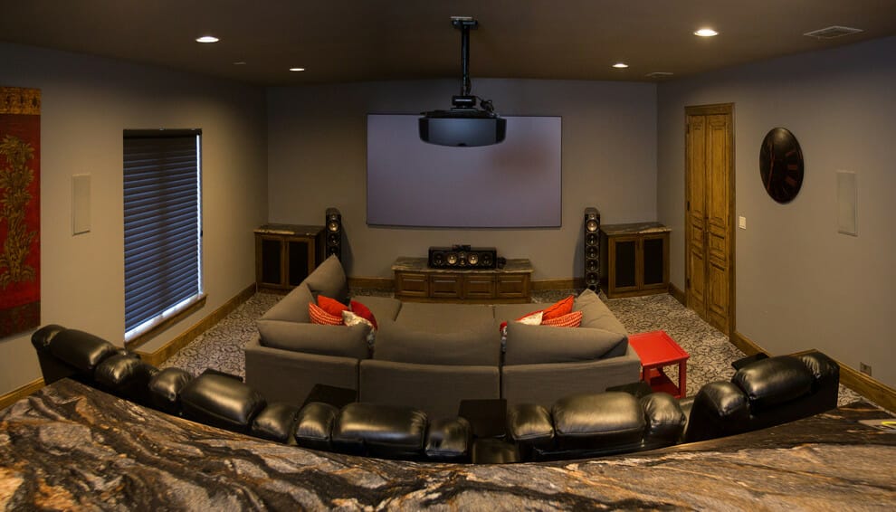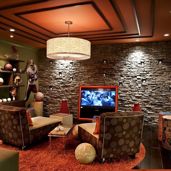 Have one of the walls finished with wood planks, even out a wall-to-wall carpet, adorn the seating with patterned cushions, and you obtain a private underground home theater.