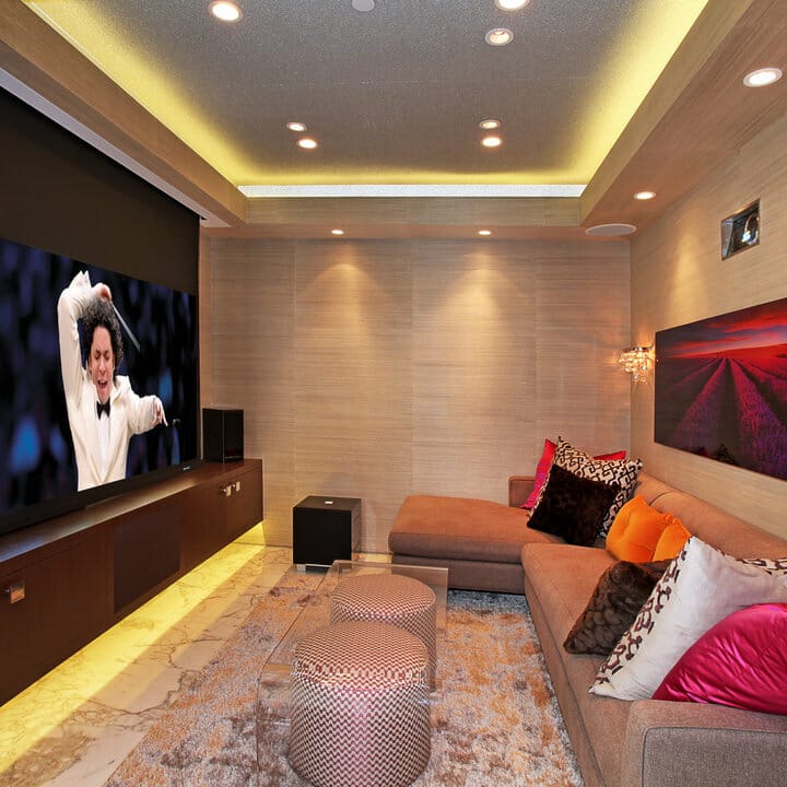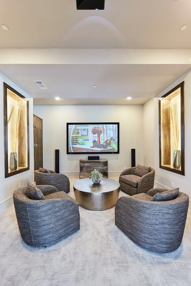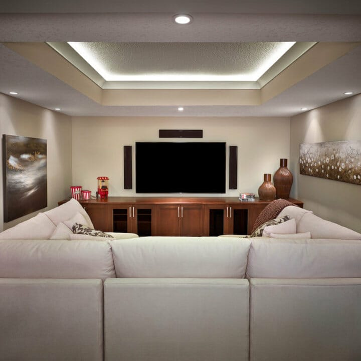 This media room features tray ceiling with architectural lighting. The indirect light at the center then gets help from the surrounded recessed lamps.