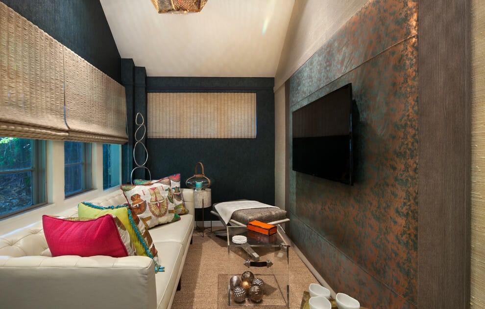 Hence, it features bamboo curtains to give the space some shade when the movie plays, lengthy white sofa, carpet, some decorations, and a television. The TV wall uses some kind of finishing with rusty look.