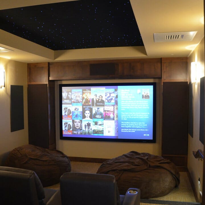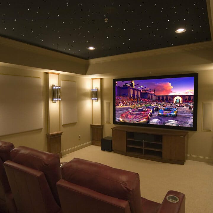 This home theater has a unique feature at the ceiling. People call it fiber optic star ceiling LED. You could install it, too, using pins, adhesives, impaling clips, or Z-bars.