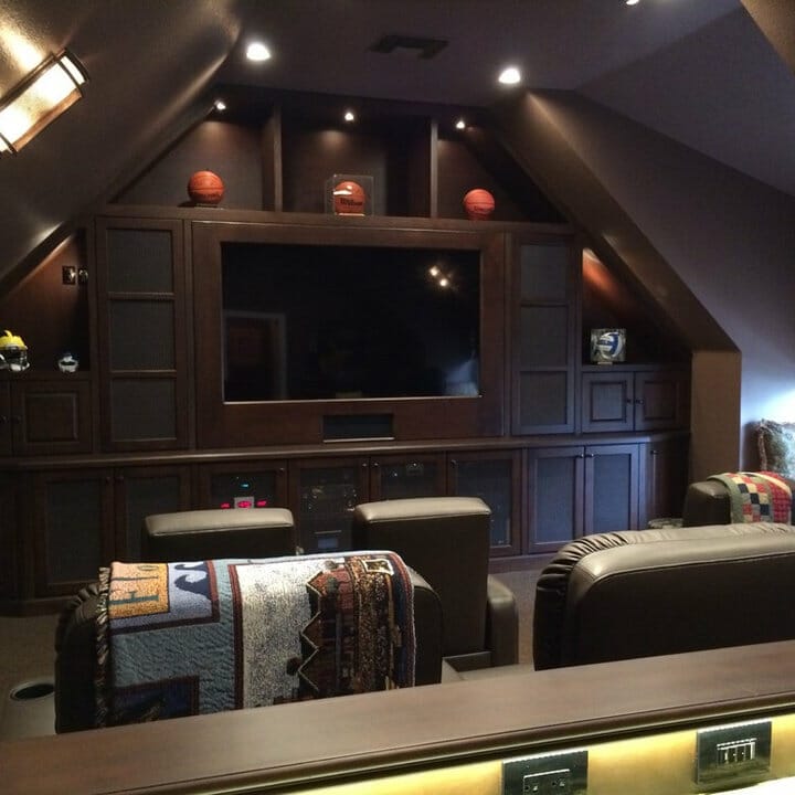 With the solid oak use and the molding design, this room looks like library turned home theater. It is somehow imaginable how people help to bring out the book racks and reading benches of the room.