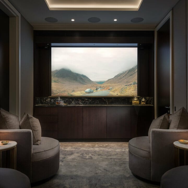 A well-designed contemporary home cinema room in Jaipur, India, features a skimmed ceiling, recessed projection screen wall, and light tone wooden floor.