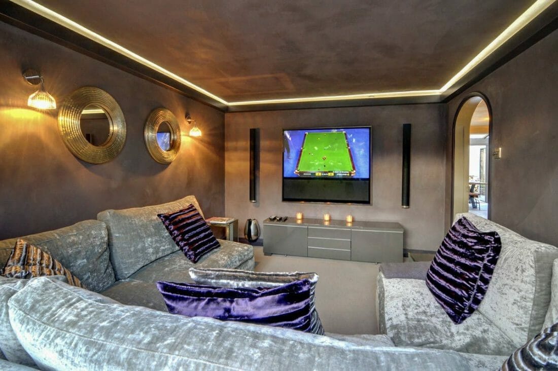 For example, it features a soft corner sofa, a wall-to-wall carpet, and the proper viewing distance to build convenience. Along with it, this space chooses calming tones for the serenity.