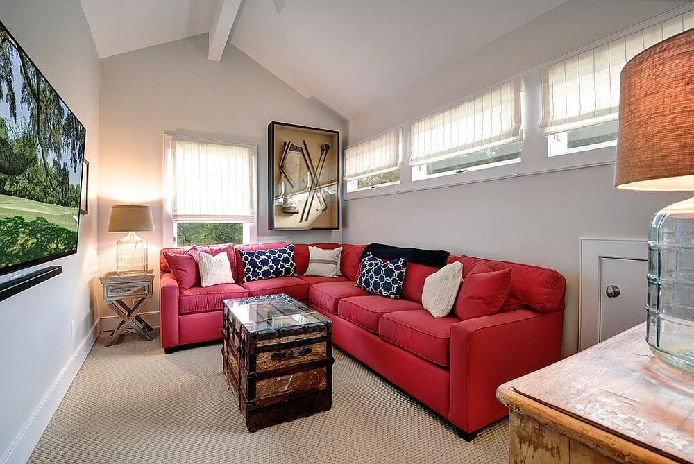 This home theater room pursues coastal style. It is noticeable from the roman blinds that reminisce the wavy sea when opened, the weathered end tables, the treasure chest turned coffee table, and the glass lamp tables.