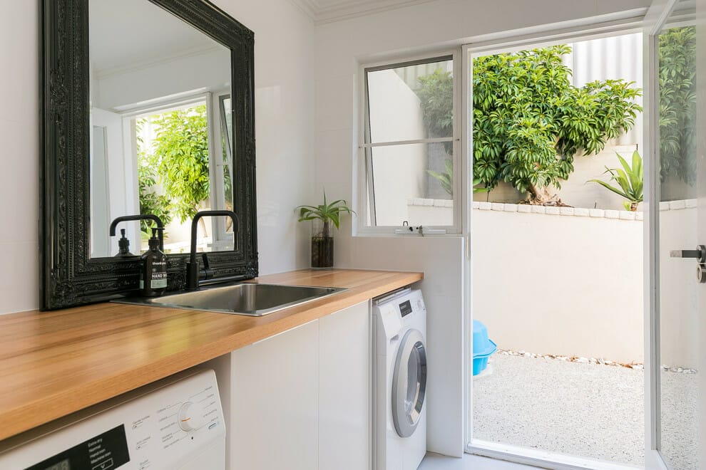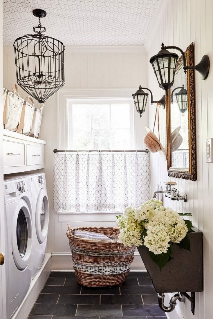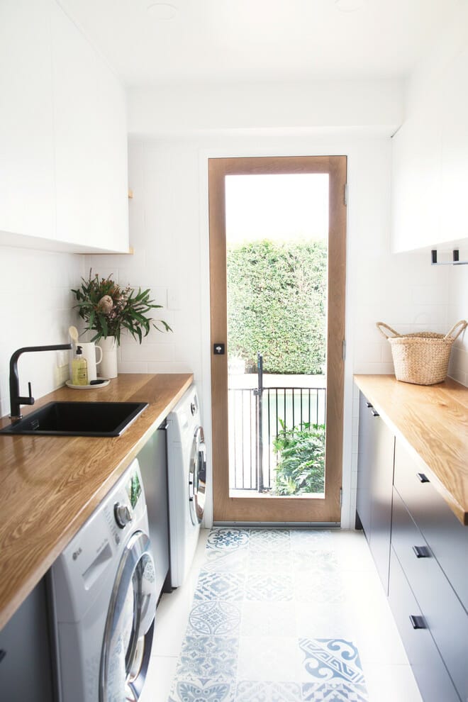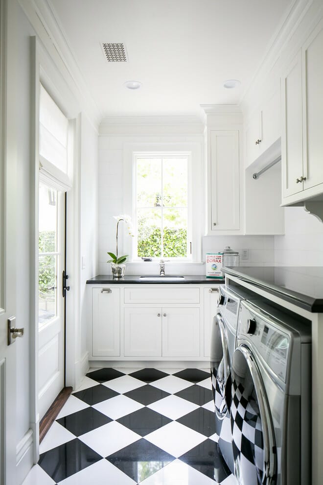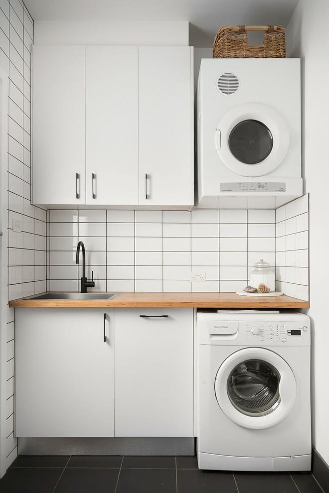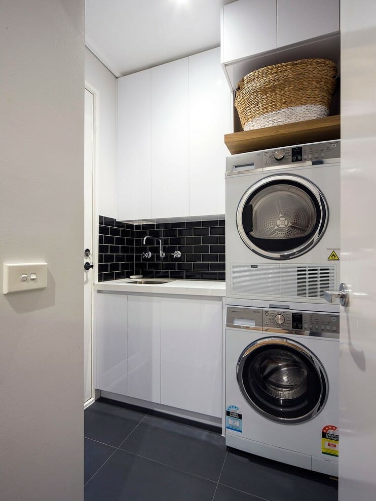 Aside from any other small laundry room ideas with sink, this one applies white in most surfaces for a brighter look and airier feel. Then, black comes to accentuate the scheme.