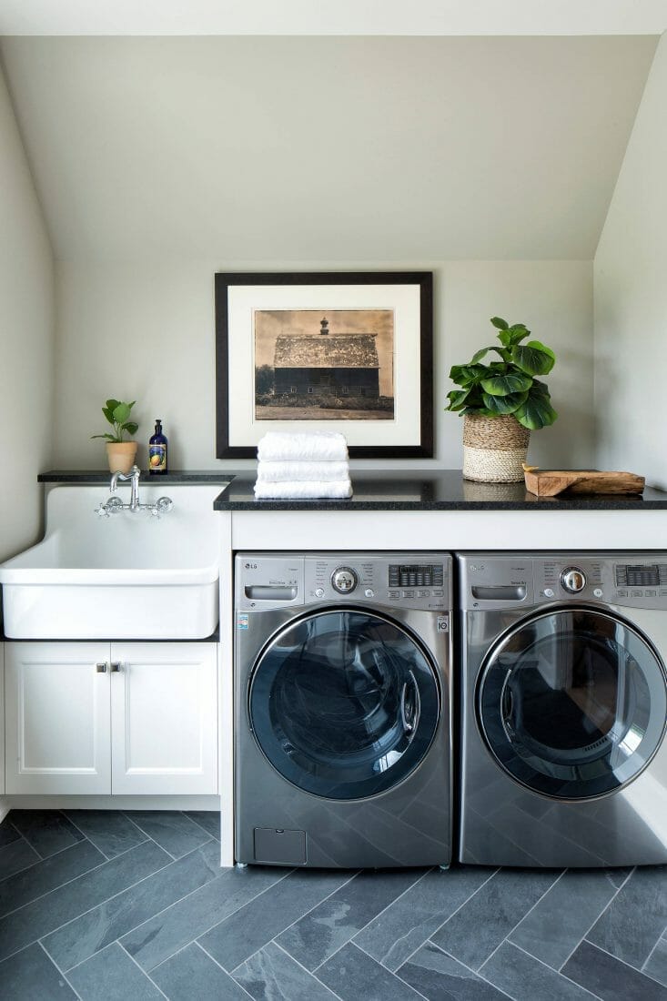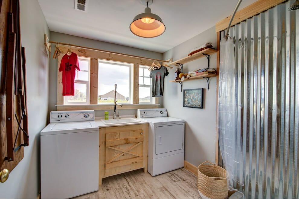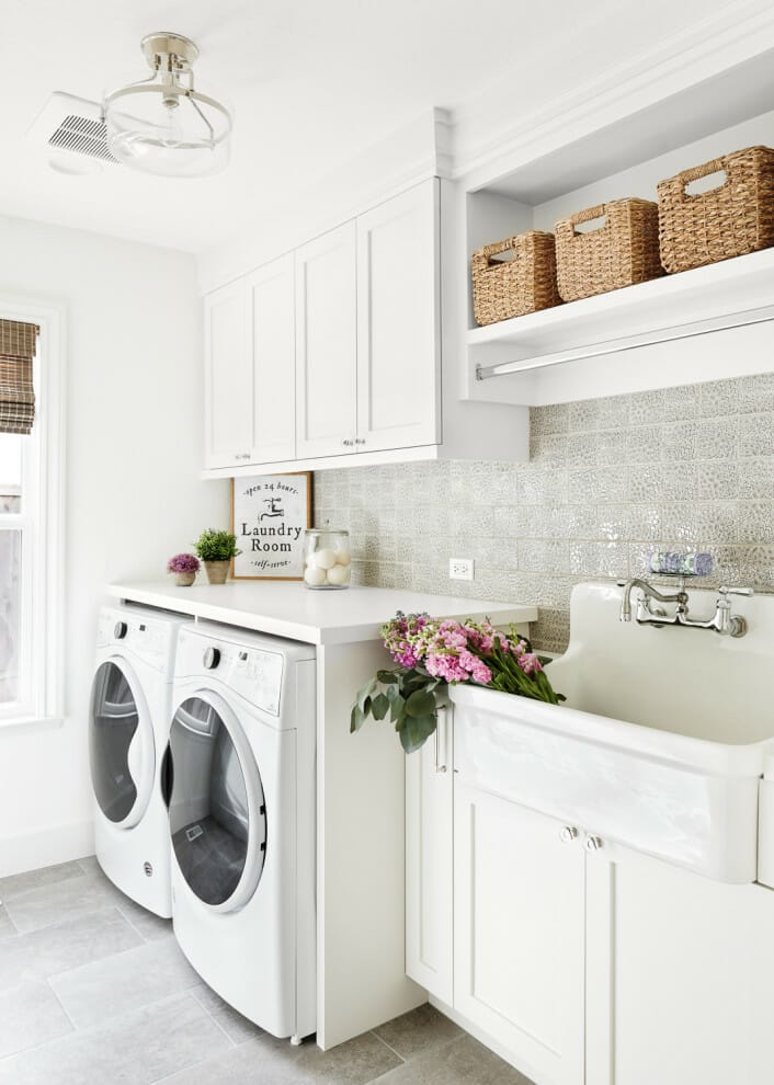 Differ from other small laundry room ideas with sink, this laundry room features a farmhouse double-tap sink. It also stands on the same line as the washing machines.