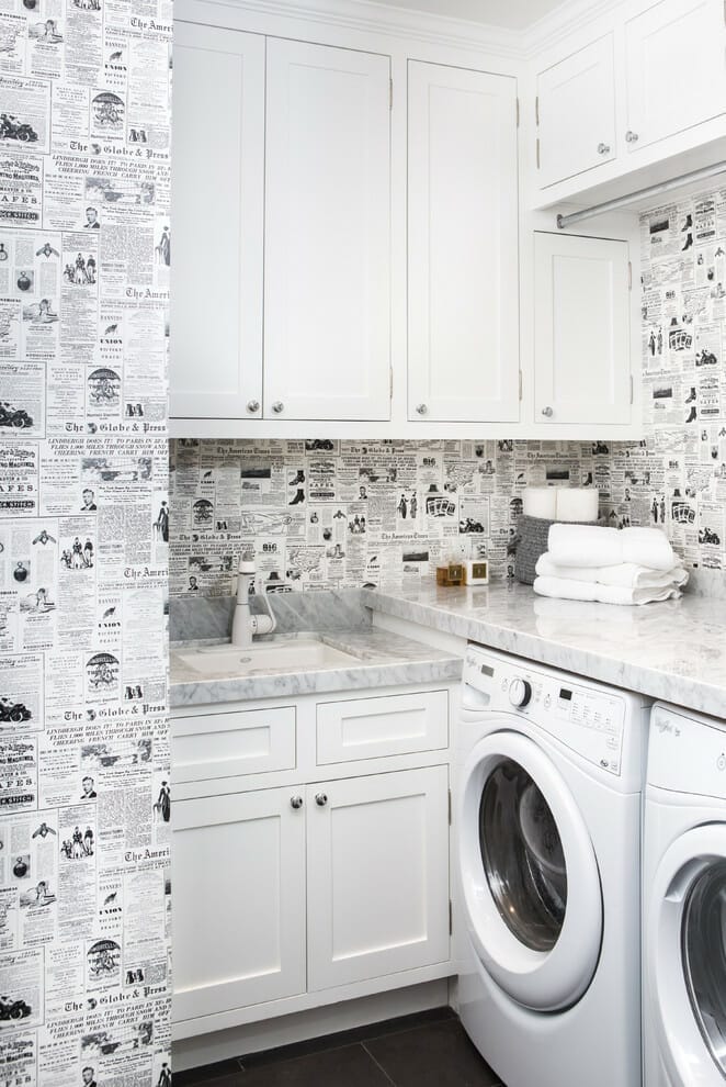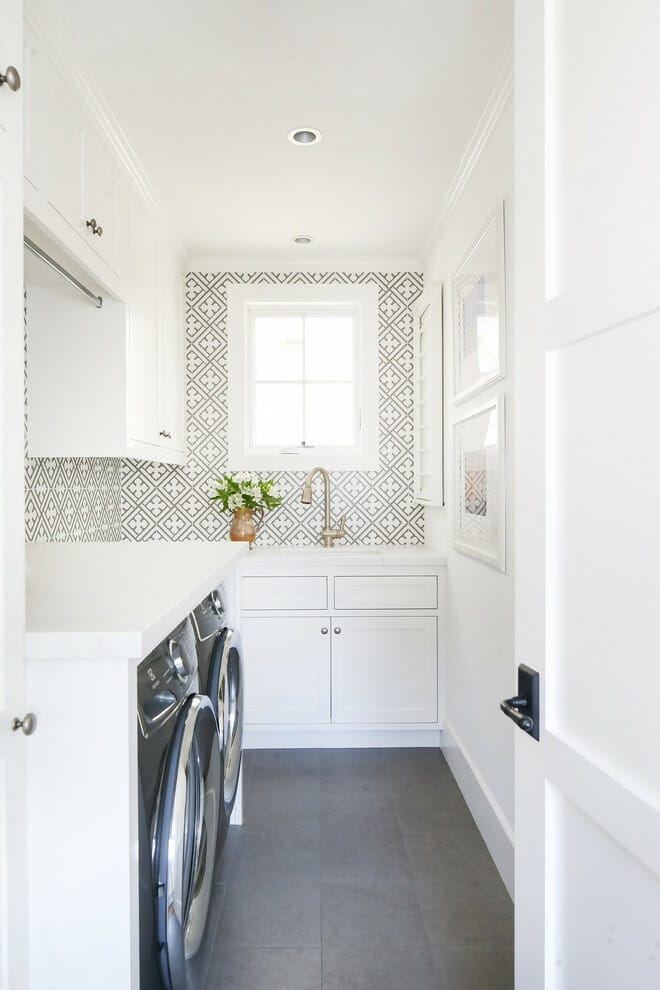 In a bright L-shaped laundry room like this one, black and white patterned walls and backsplash are pleasant to see.