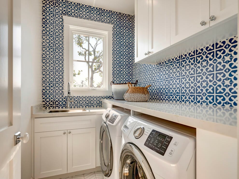Coming through, another idea of tiling the laundry backsplash with patterns! The blue and white combination makes a good accent for a crisp whitewashing room.