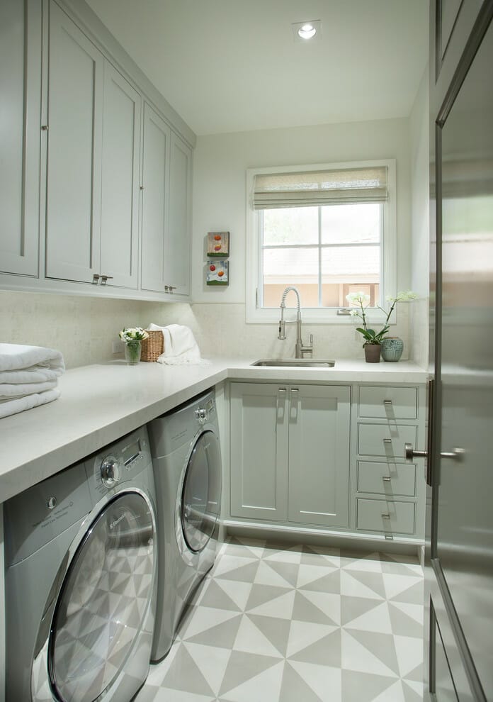 Yet, it is not the only part with patterns inside this L-shaped laundry area because it also uses small chevron tile flooring.