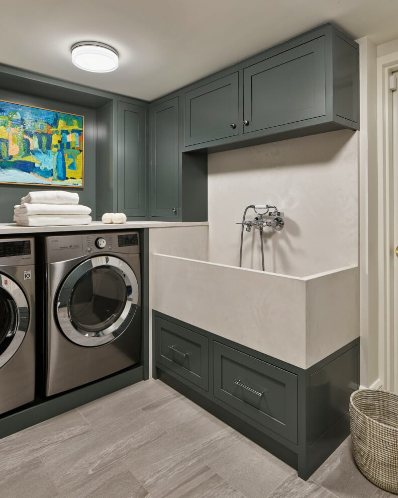 This laundry room features a concrete double-tap wall-mounted sink for space-saving. Indeed, more visible floor surfaces mean a roomier feel.
