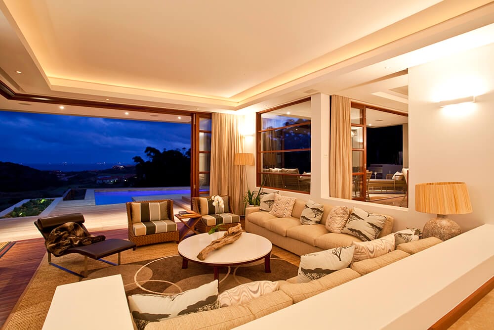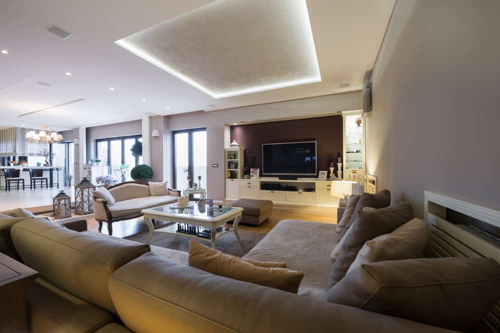 The large sofas and throw pillows set a cozy ambiance. Besides, the tray ceiling and accent lighting embrace modern design.