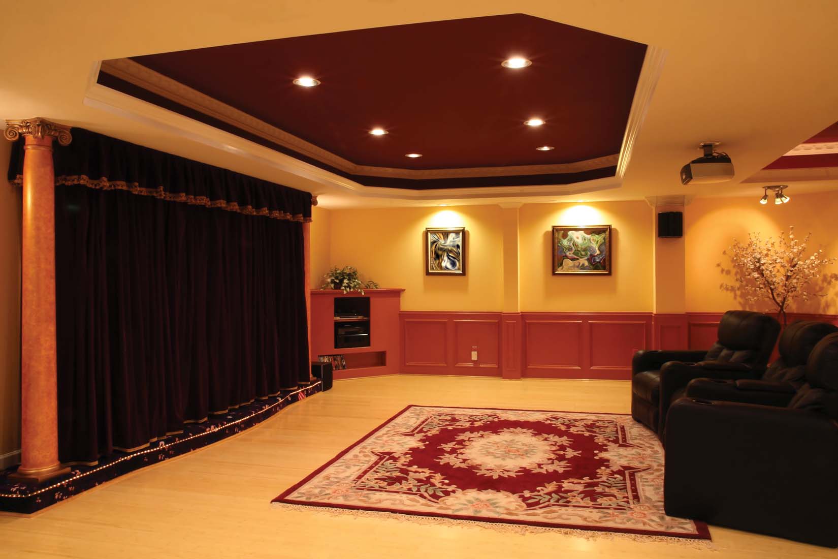 A dark red octagon tray ceiling gives this home theater a dramatic effect. The curtain, rug, and pillars lend the room elegance.