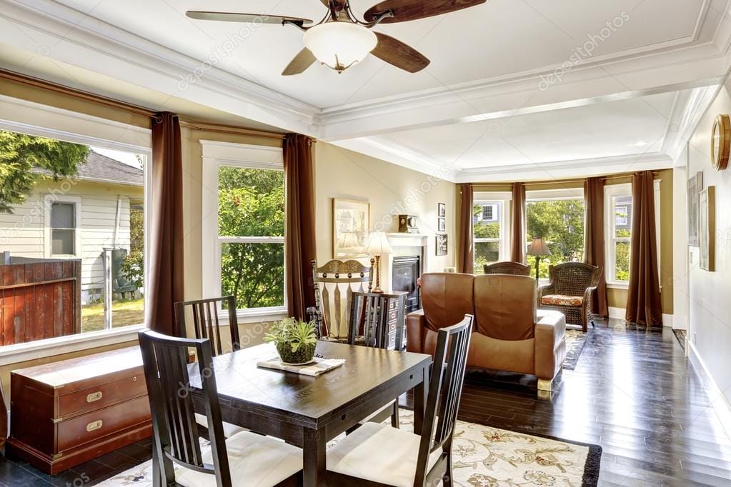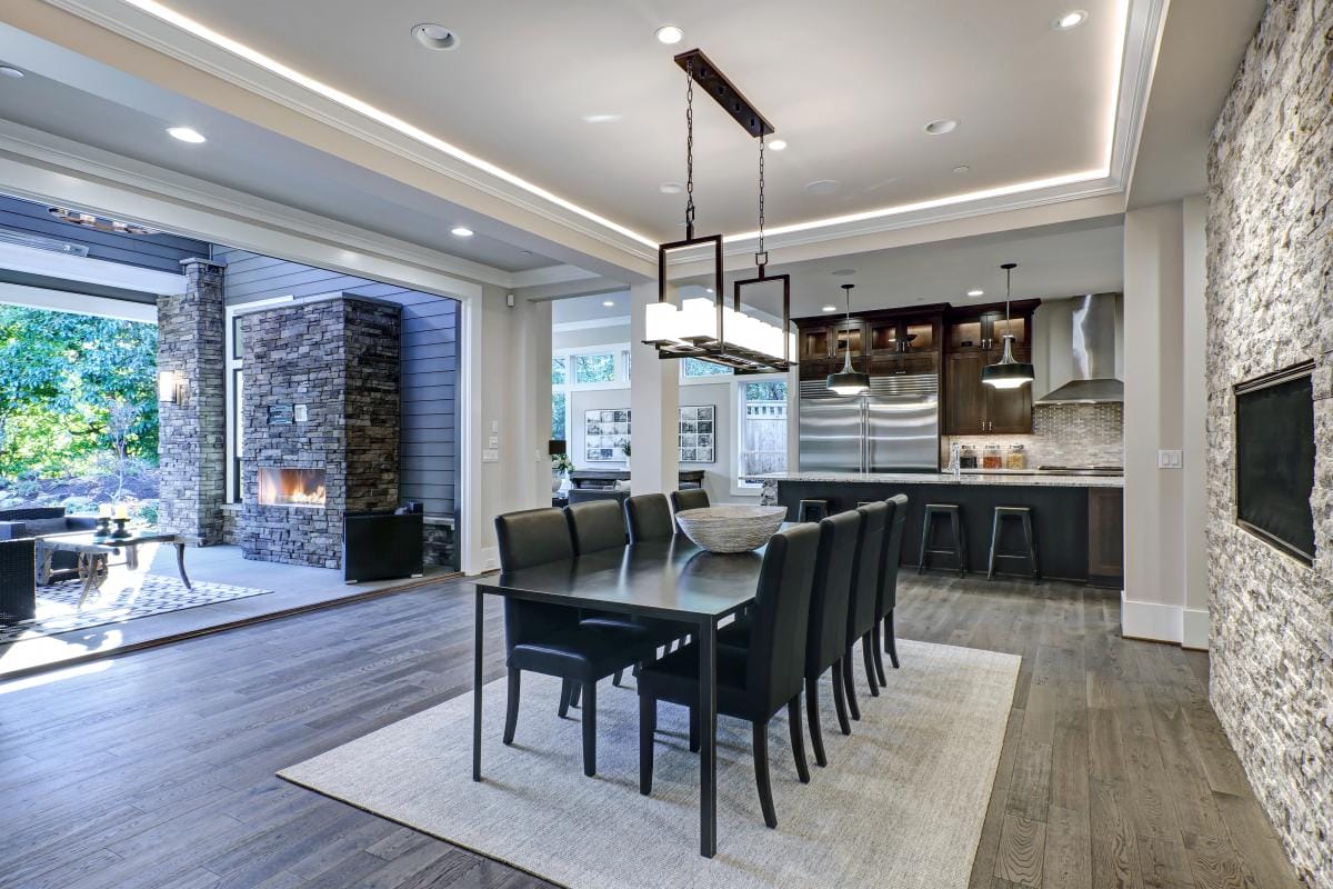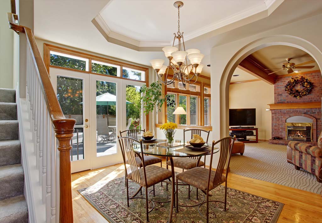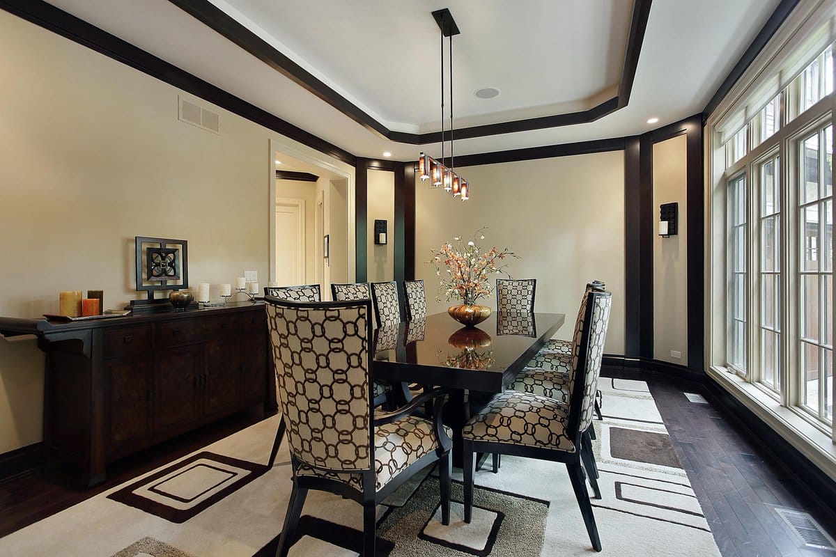 This dining room features a double tray ceiling. In an instant, it makes the culinary space feel more elegant and sumptuous.