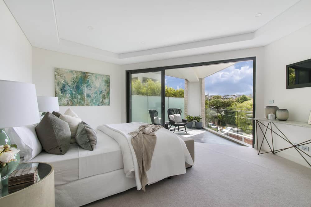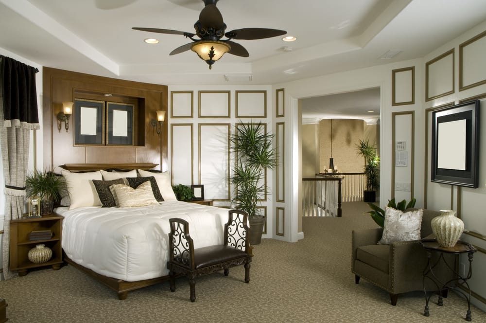 As you see, this master bedroom employs light taupe walls. The dweller used the same color to paint the horizontal and vertical parts of the tray. They instantly make the ceiling appear taller.