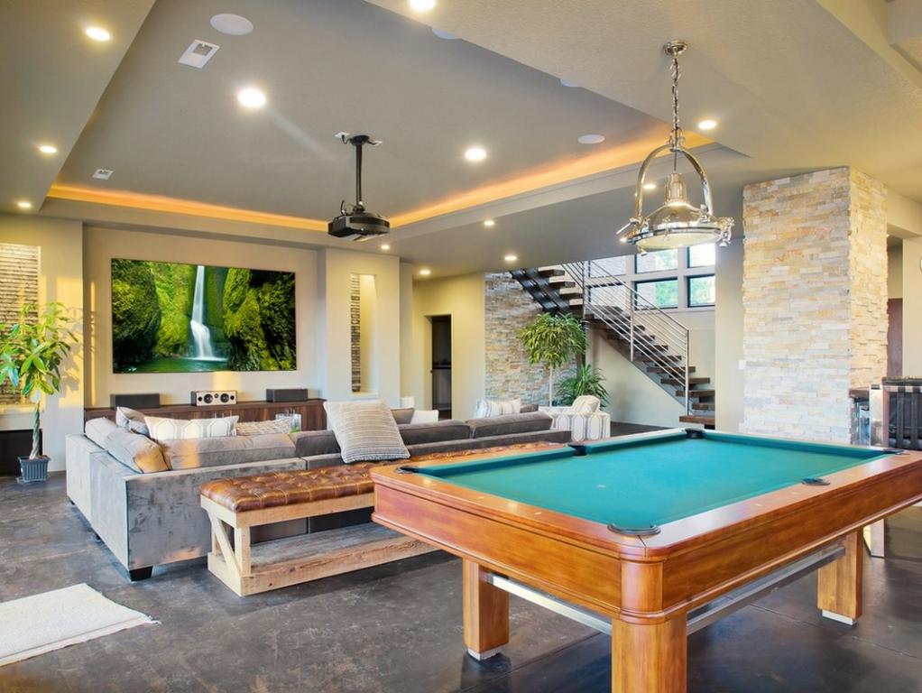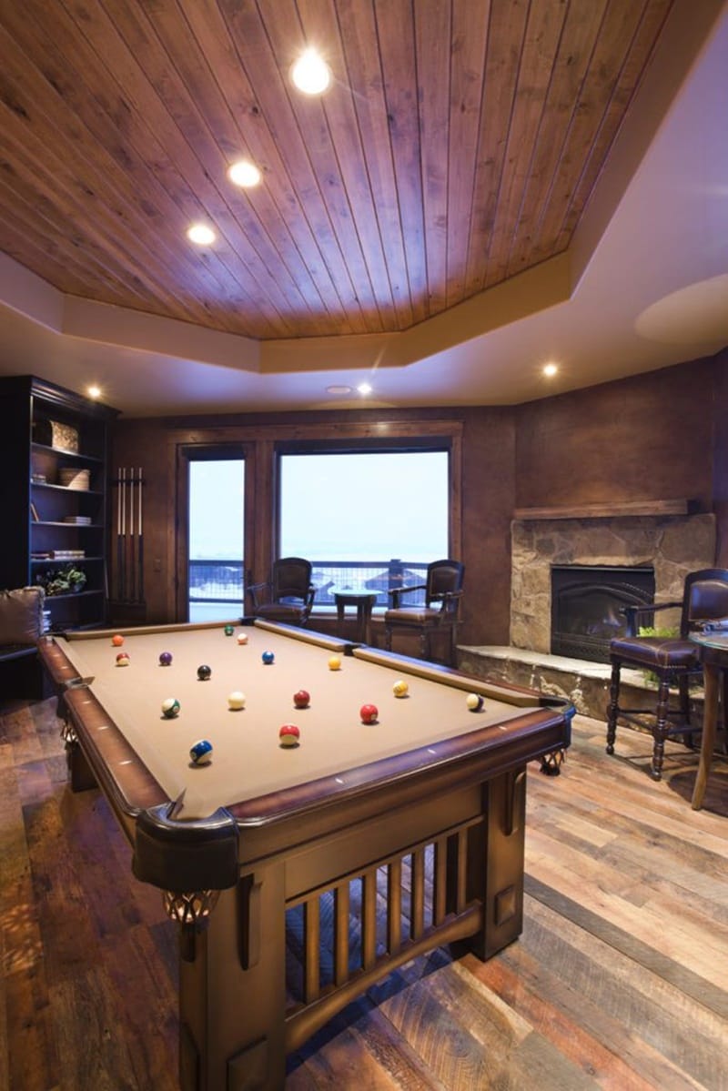 Both the wood tray ceiling and floor inject an inviting ambiance into the game room. The recessed lights illuminate the space.