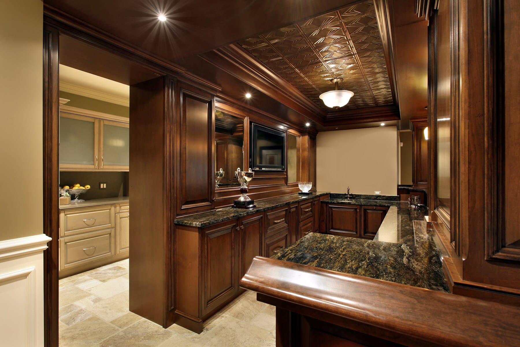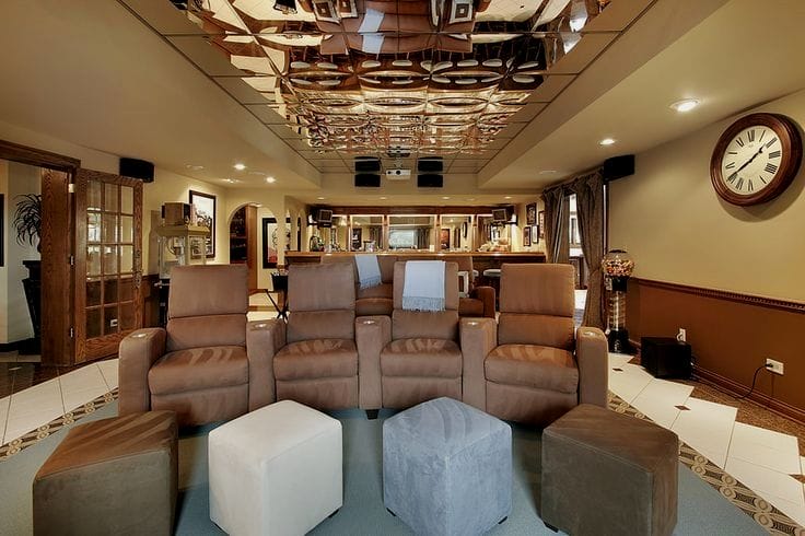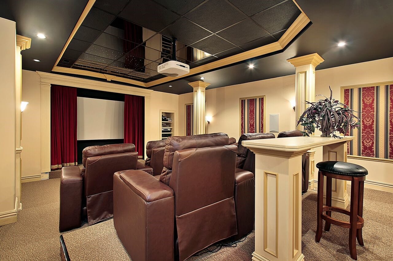 This home theater has a delightful metallic tray ceiling. The walls and furniture units match well with it.