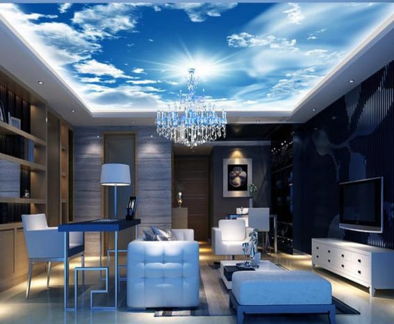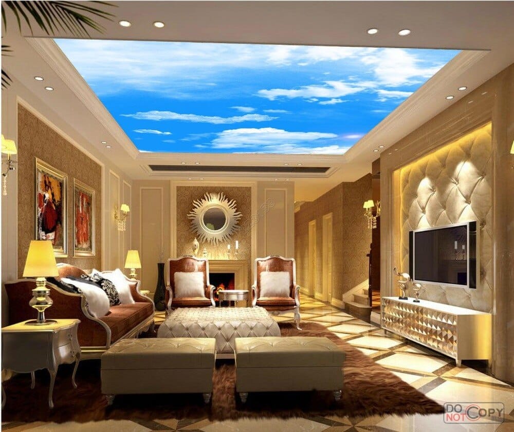 The furniture sets give this living room a modern feel. A blue sky-wallpapered tray ceiling freshens up the space.