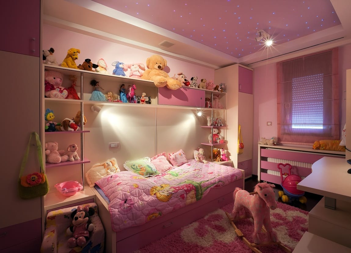 Different shades of pink give this bedroom a girly feel. The tray ceiling features twinkling lights.
