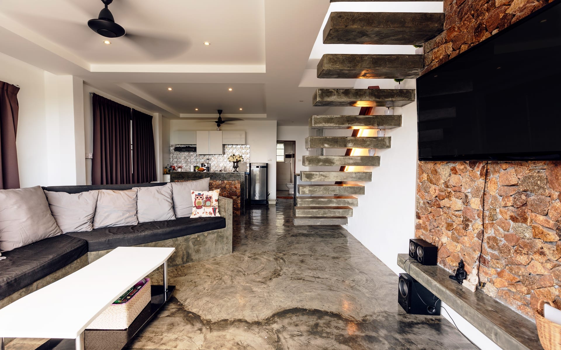 A black ceiling fan is a high contrast to the white recessed ceiling. The staircase, floor, and accent wall add texture to the room.