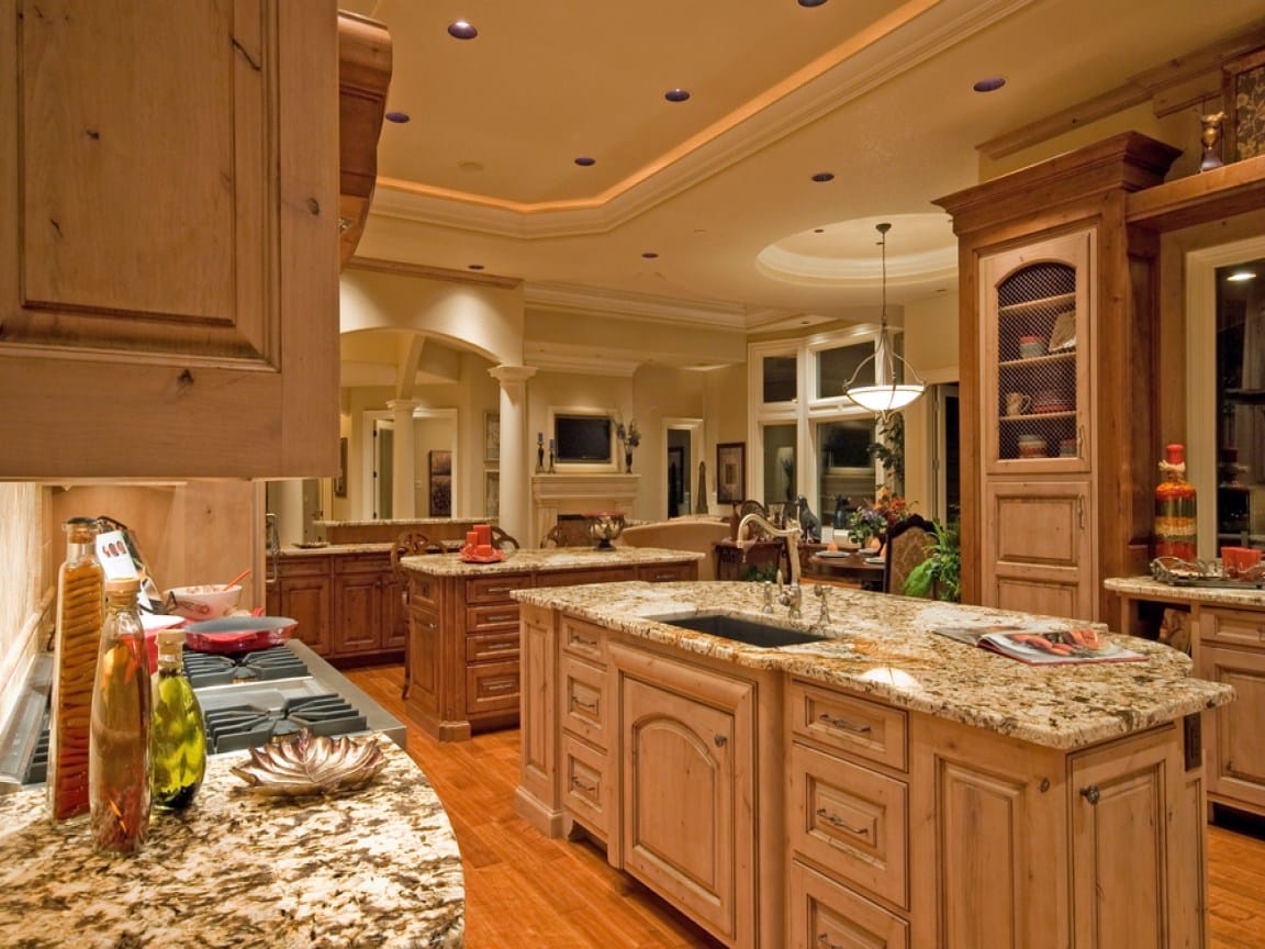 Wood tray ceilings give the room a touch of rustic sophistication. The chandelier and pendant lights offer superior illumination.
