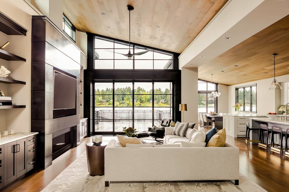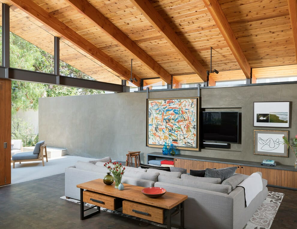 You are free to unite modern elements with rustic objects in a contemporary style. You can provide an additional wood wall to mount your TV without hiding the original architecture like the picture above.