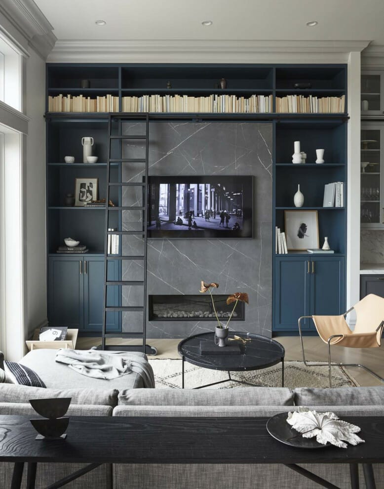 To get an elegant and classy look, you can mount the TV on the wall with black abstract wallpaper. Next, install built-in shelving around in the dark blue color.