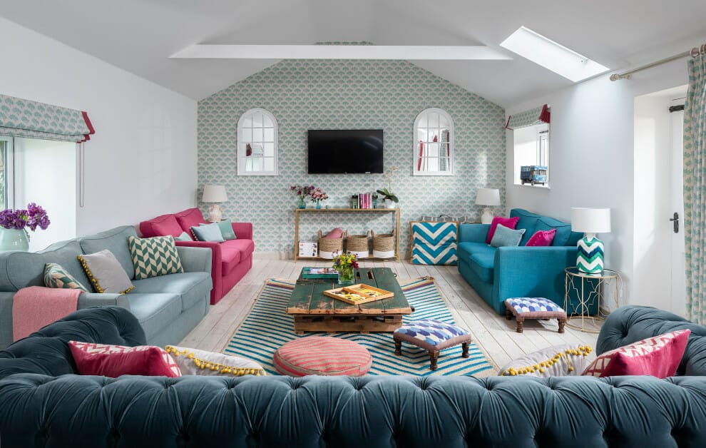 You can start from the walls covered with wallpaper, sofas in pink and blue, to rugs with symmetrical accents in similar hues.