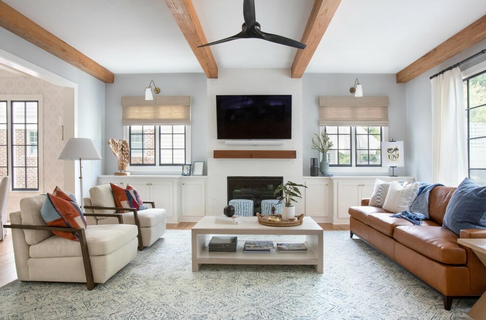 Mounting the television between the two windows is a brilliant move you can make. This layout will help make your room look more balanced and brighter too.