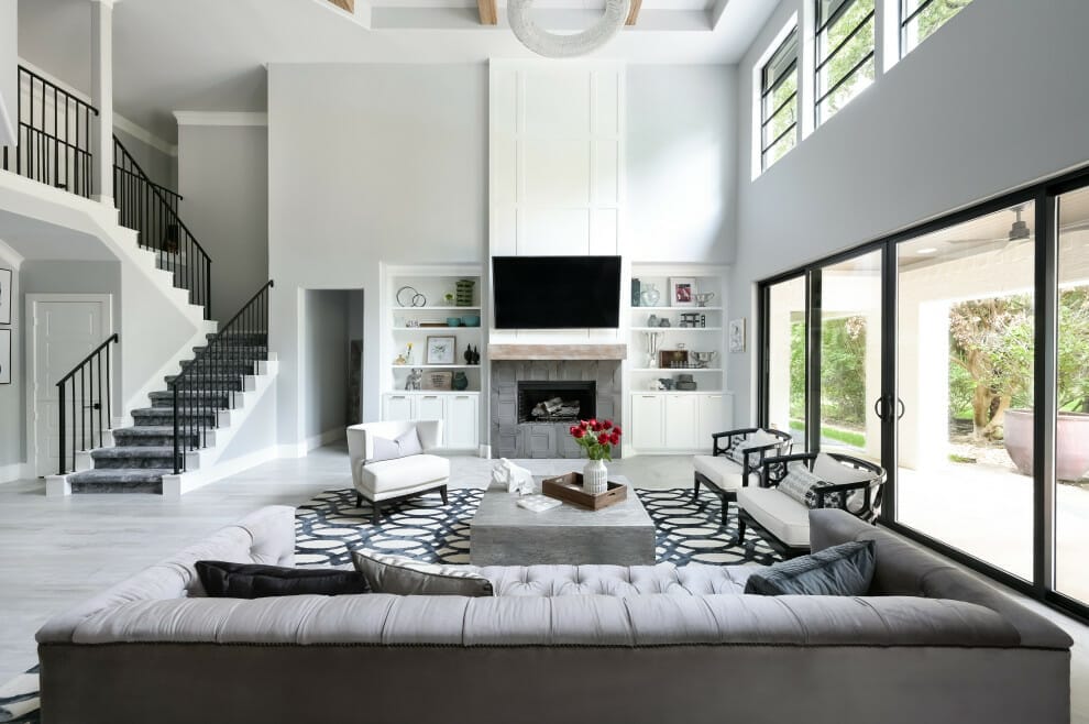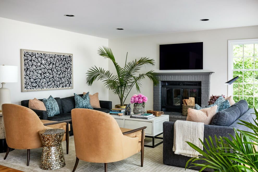 As you can see in the picture above, the wall behind the TV has a similar pattern with curtains, rugs, tufted coffee tables, and stools. They all go well together.