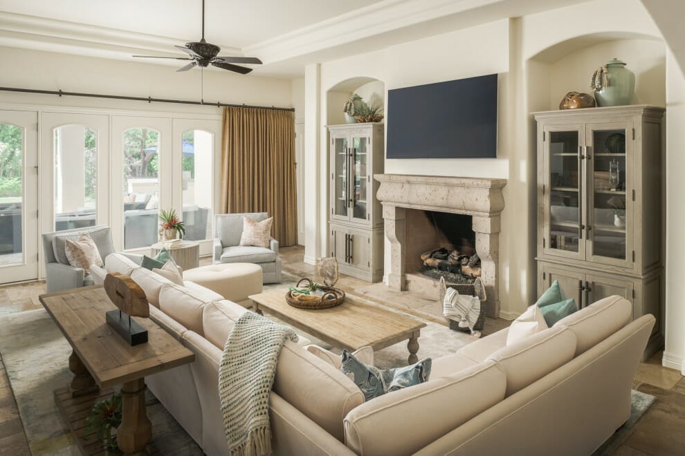 TV mounting on the limestone wall, why not? It is automatically stunning and has character even without any wall art.