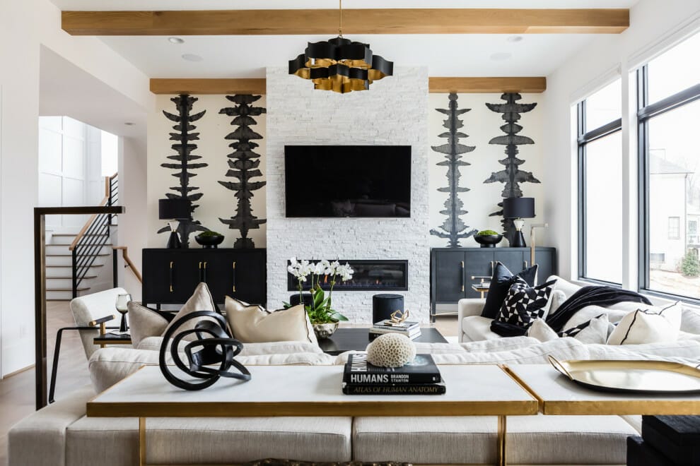 However, all-black TV mounted on wall ideas are not enough to attract visitors. Therefore, expose all the solid beams texture on the ceiling to add drama to your sitting room.