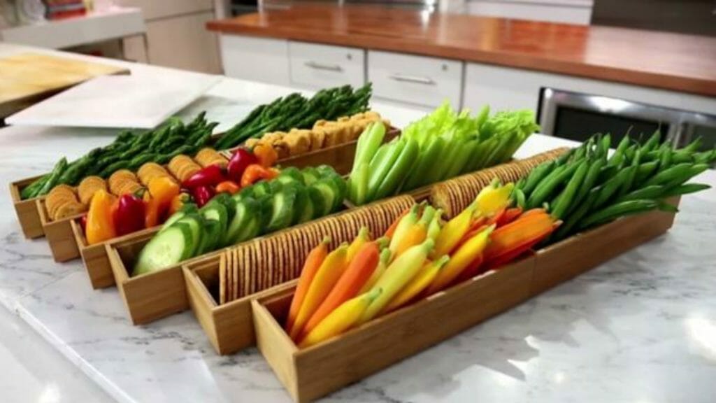 A different way to assort the ingredients means another insight from vegetable tray ideas. Above the countertop, you see an array of six lengthy trays of vegetables and crackers neat arrangement.
