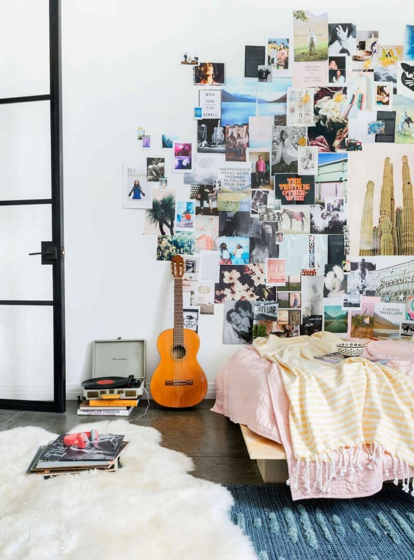 Simple photo collages above the desk remind you of your high school besties. Meanwhile, blonde wood clothespins display hanging photos well.