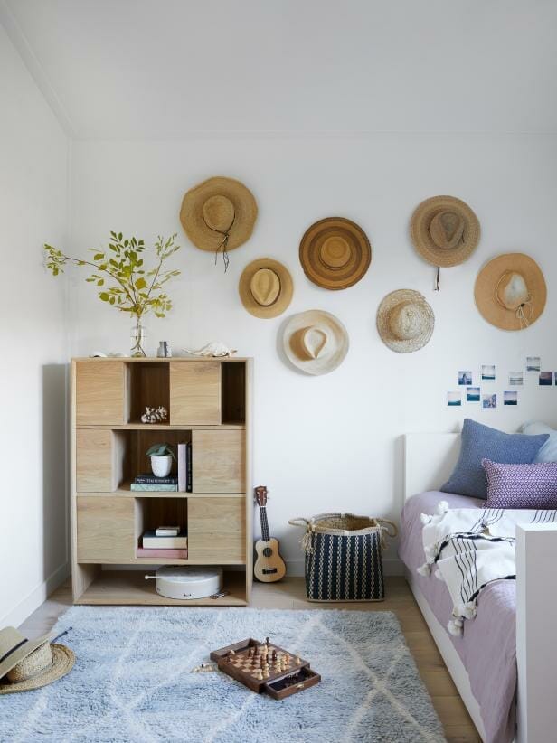The pale wood shelving unit keeps greenery, ornaments, and books in place. Also, varying kinds of beach hats produce coastal vibes. Meanwhile, the coordinating photo collage over the white headboard accompanies them.