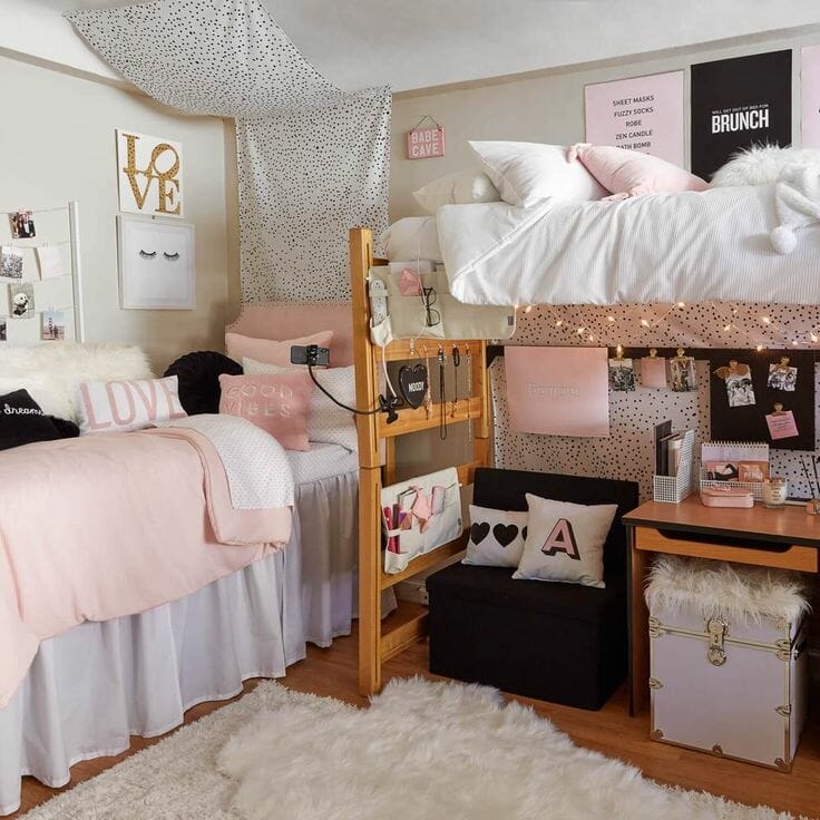 Need charming photo collage dorm room ideas? The loft-style beds save some usable floor space. Furthermore, they accommodate study spaces underneath. Also, wooden units and tiny striped rugs warm the dorm room up.