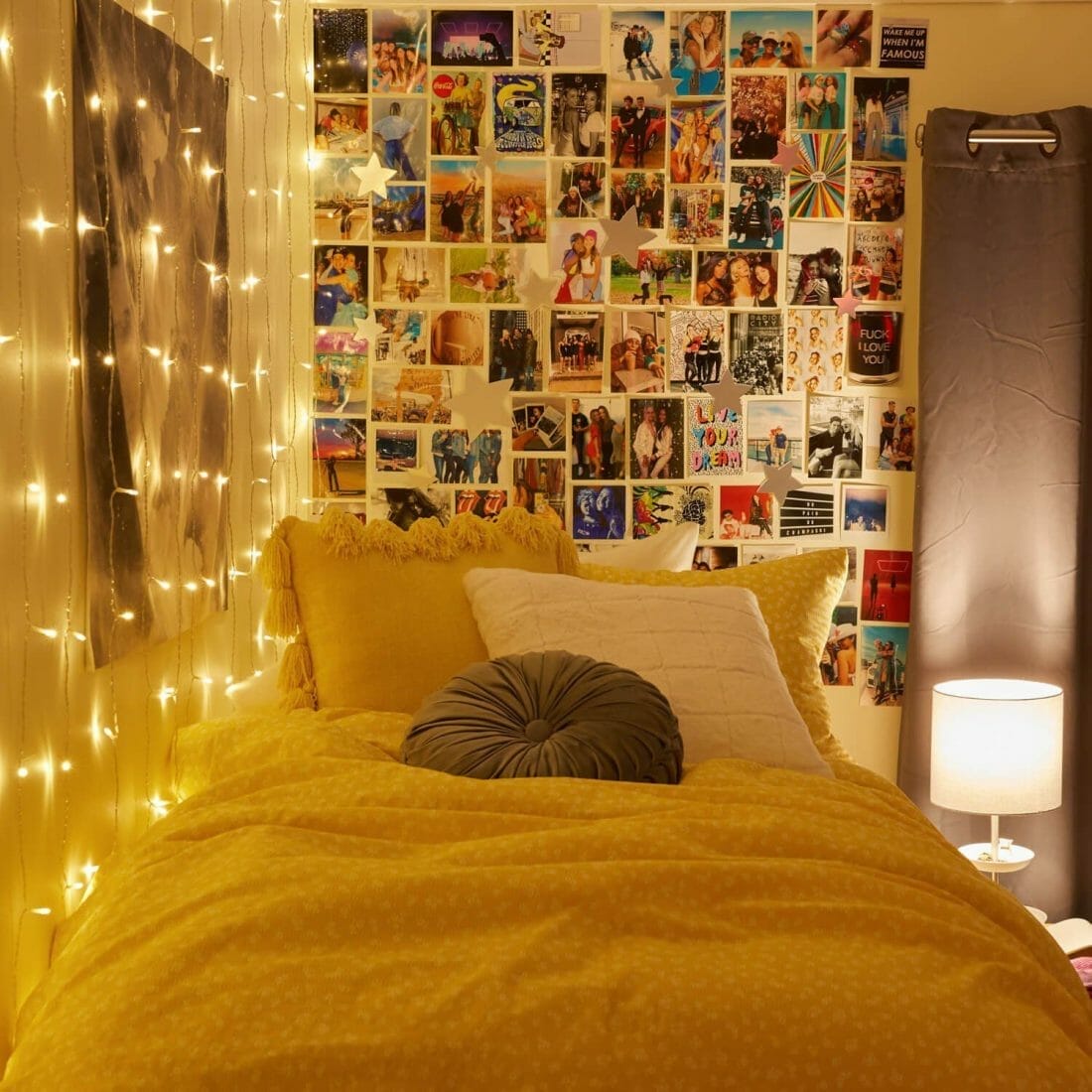 Couple the photo collage with cascading string lights. Moreover, use the yellow bedding to give the dorm room some cheer.