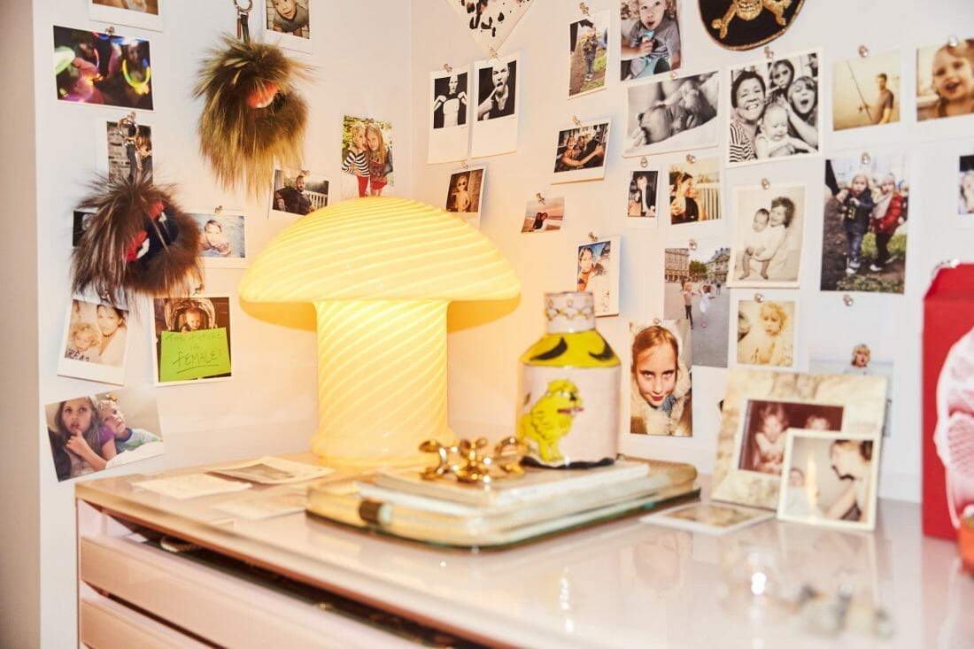 Since the space isn’t enormous, the dweller sticks her photos to the white furniture. They make for a striking photo collage.