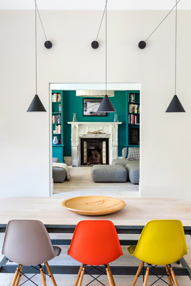 As you see, the soft white partition wall mingles with the pale wood dining table and flooring. Meanwhile, the teal wall and colorful chairs keep the interior from feeling one-dimensional.