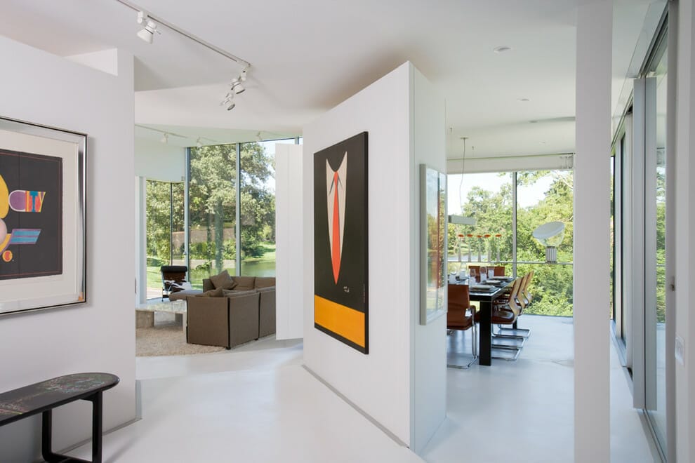 Some dividing wall ideas boast fireplaces, and this layout too. The clean white paint, modern furniture, and window walls make things peacefully airy.