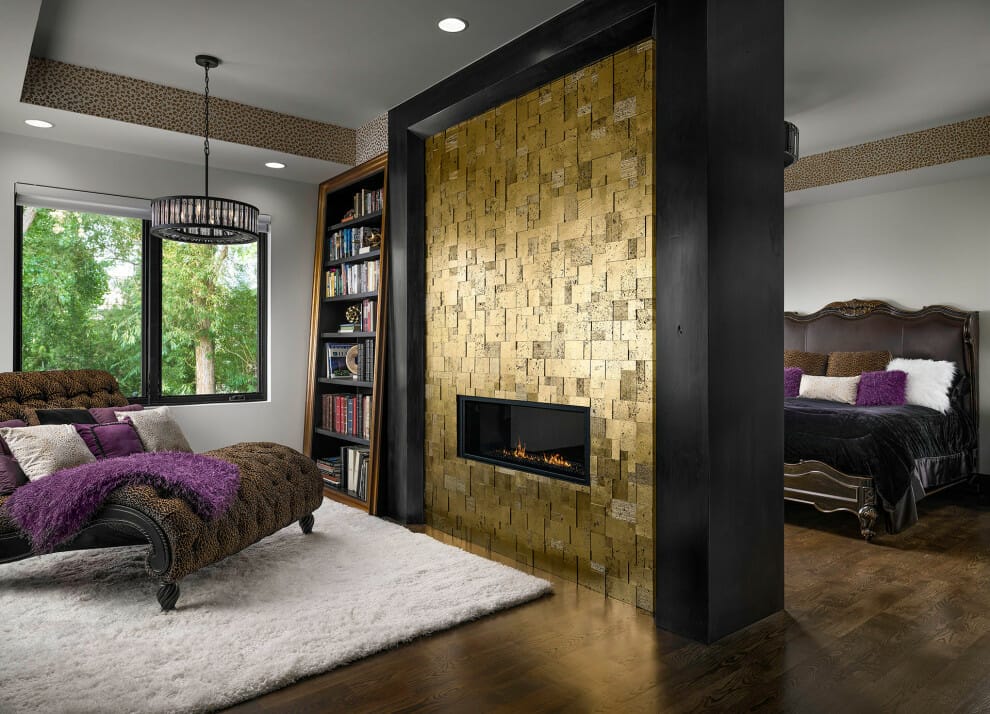 Speaking of glamorous room divider ideas, take this gold separation wall into account. It has a built-in fireplace that helps the homeowners create an intimate scene.