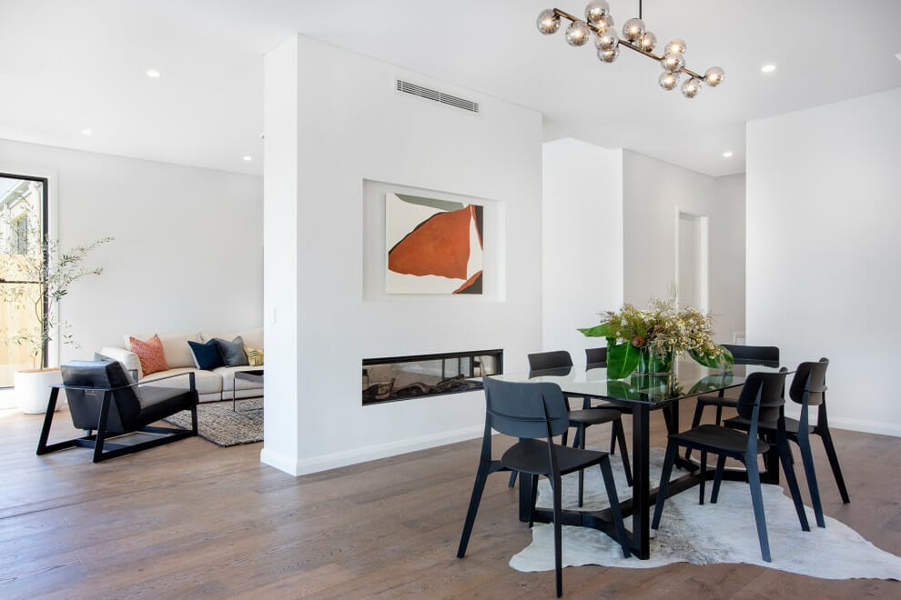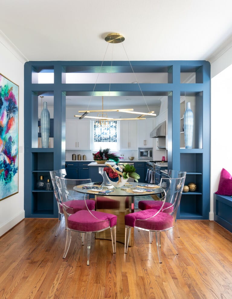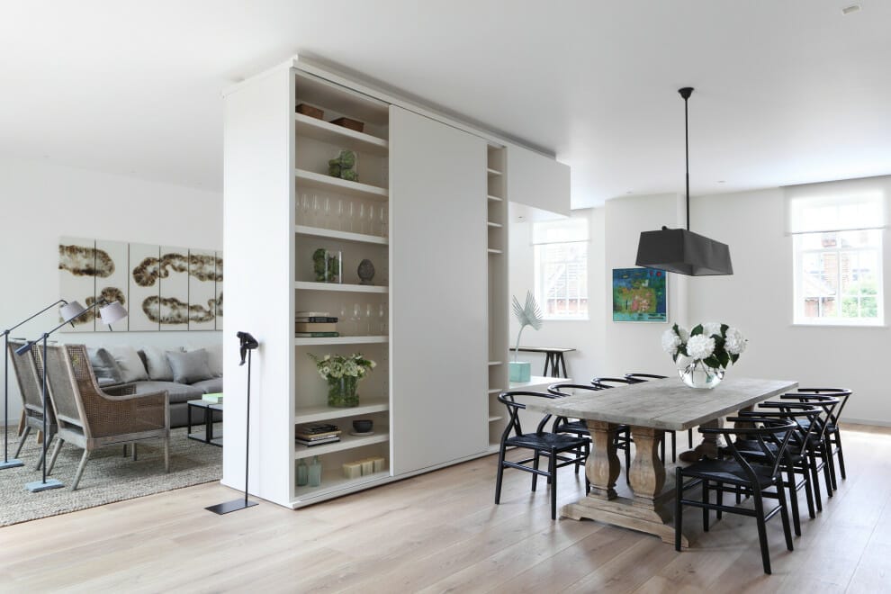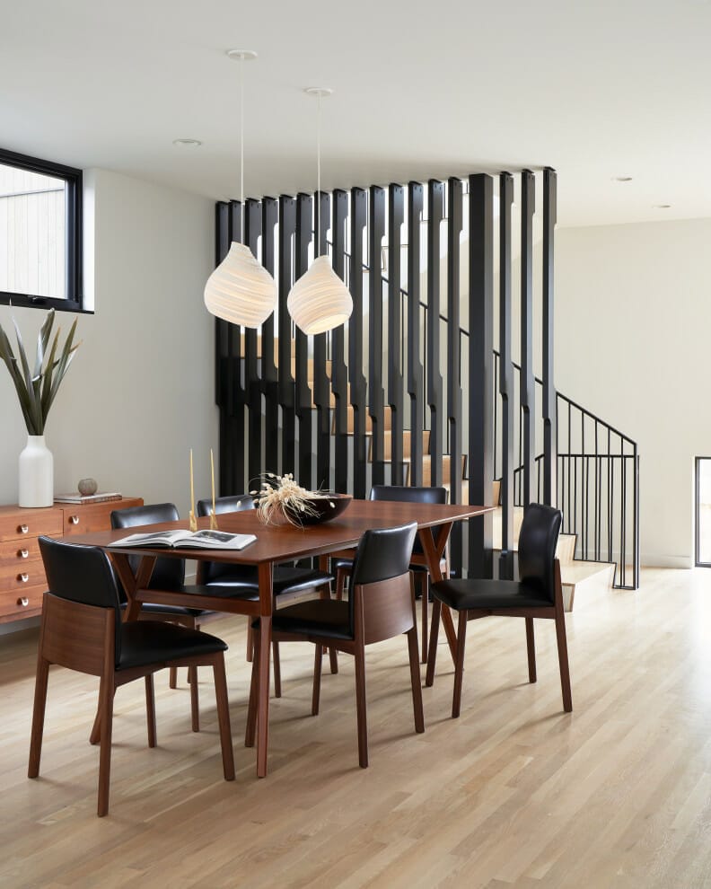 You can use interior dividing wall ideas to separate the rooms with different decor styles. This partition wall, for example, distinguishes a mid-century modern eating area from a transitional family room.